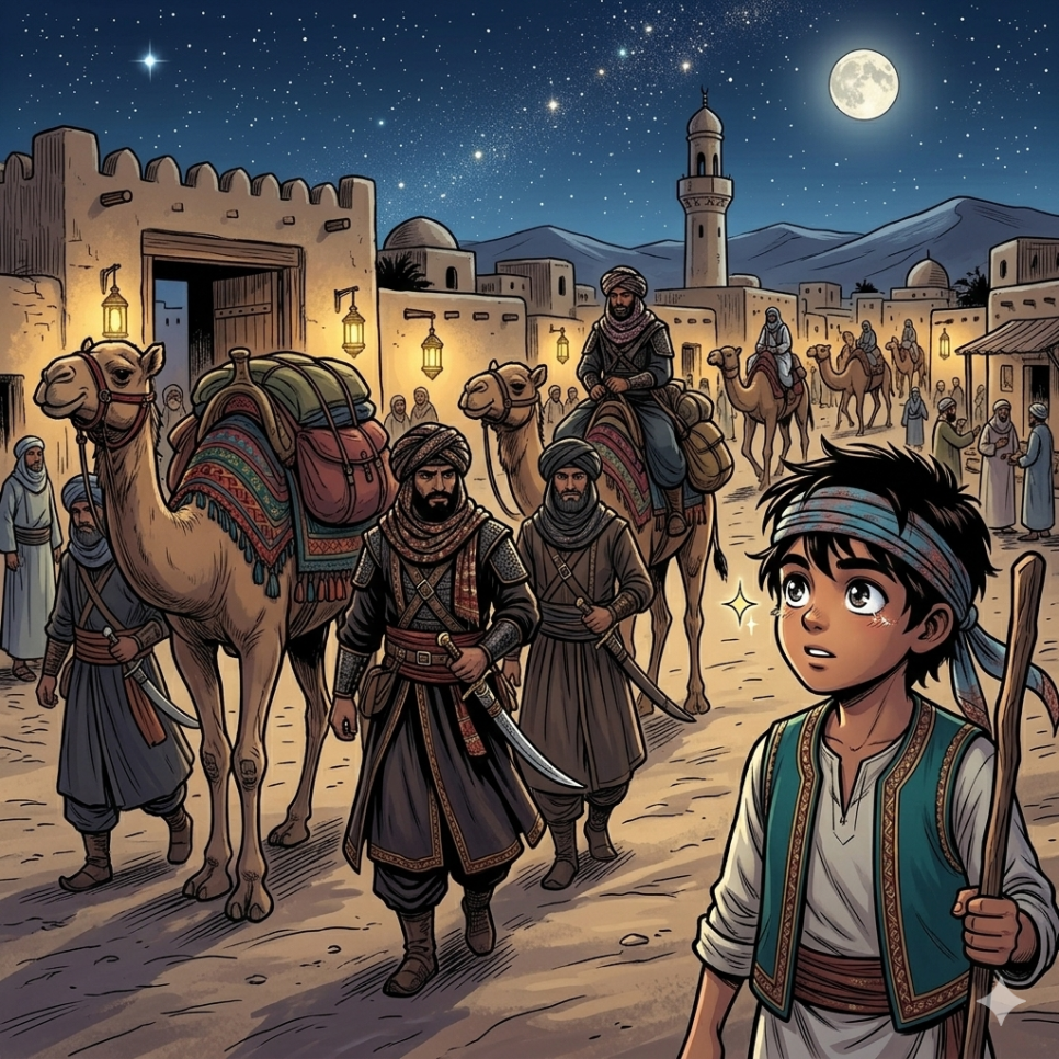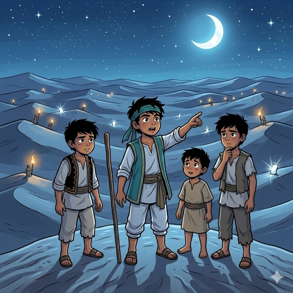 그리고 친구들과 함께 놀라운 계획을 세웁니다. 사막의 모래 언덕과 거울, 횃불을 이용해 마치 큰 군대가 있는 것처럼 보이게 만든 것입니다. 그 덕분에 도적들은 겁을 먹고 도망가고 맙니다.