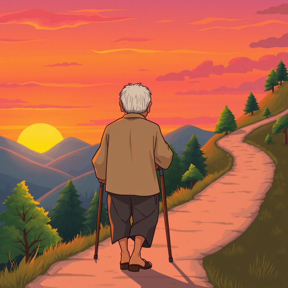 영감님은 저녁 무렵, 지팡이를 짚고 산으로 걸어 들어갔어요.