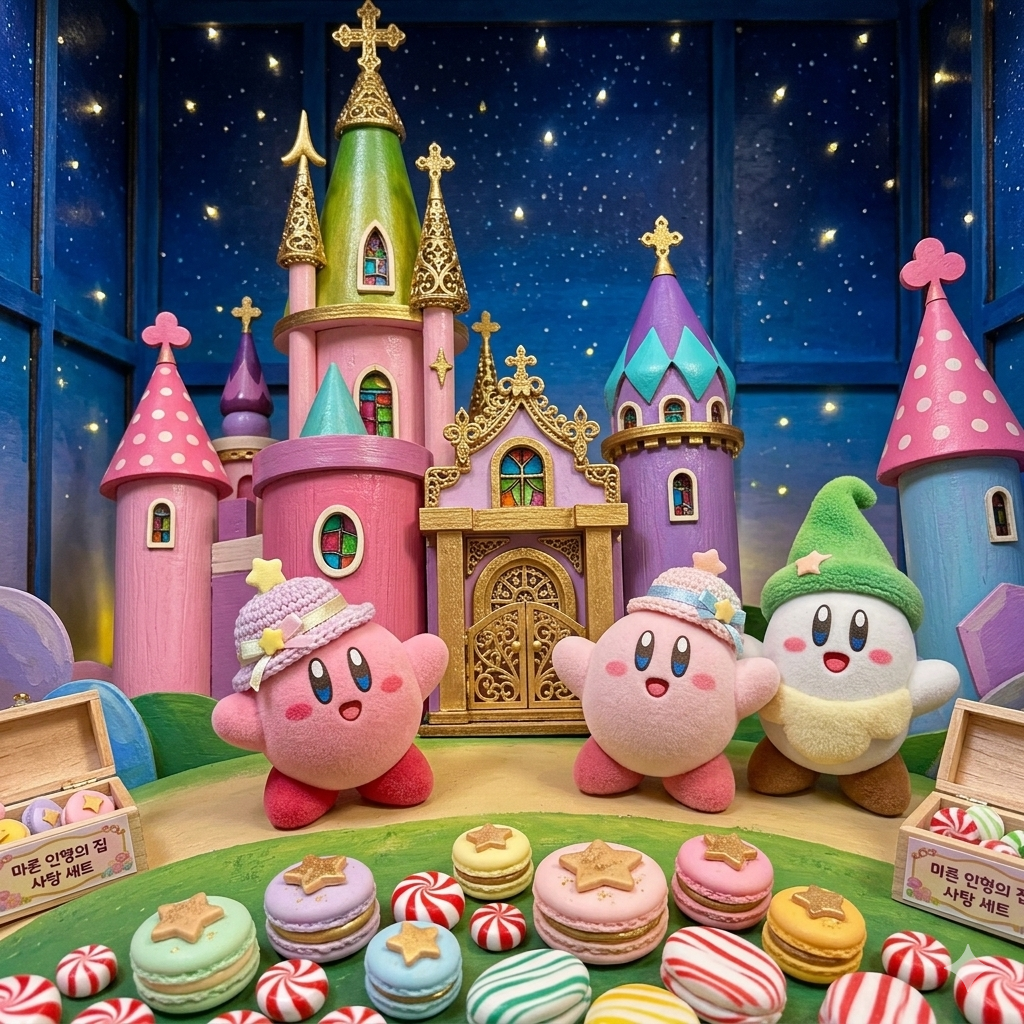 원작의 환상적인 '캔디 성'을 모티브로 하여, 실제 마론 인형(패션 돌) 놀이 세트처럼 입체적으로 꾸민 '커비의 스윗 드림 하우스' 시안입니다.