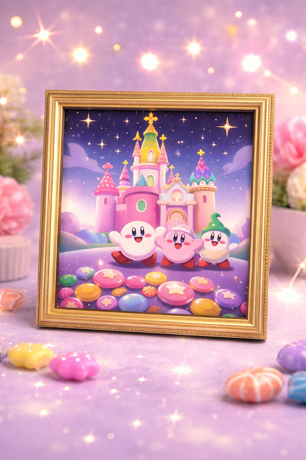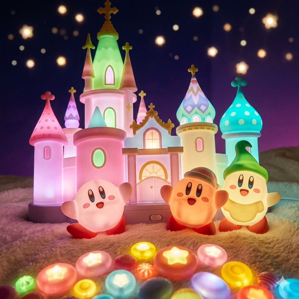원작의 환상적인 분위기를 그대로 담아낸 '커비의 드림 뷔페 캔디 성' LED 무드등 시안입니다.