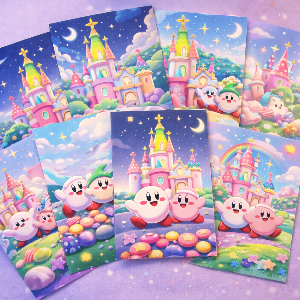 요청하신 별의 커비와 캔디 성 테마의 냉장고 자석(마그넷) 세트 시안입니다.