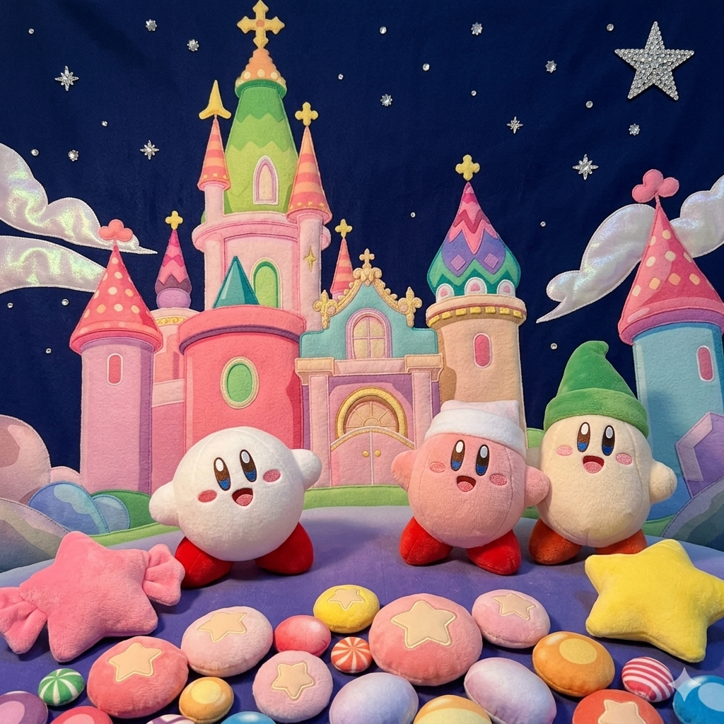 3D 캐릭터 피규어: 성 앞에 위치한 커비 캐릭터들을 입체적인 피규어로 제작하여, 조명을 받았을 때 더욱 생동감 있게 느껴지도록 구성했습니다.