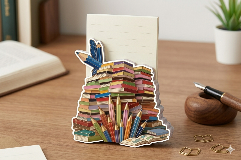 책탑 모양 점착 메모지 (떡메모지): 책탑의 실루엣을 따라 커팅된(도공) 메모지입니다. 위쪽 빈 공간에 메모를 할 수 있어 데스크용으로 인기 있습니다.