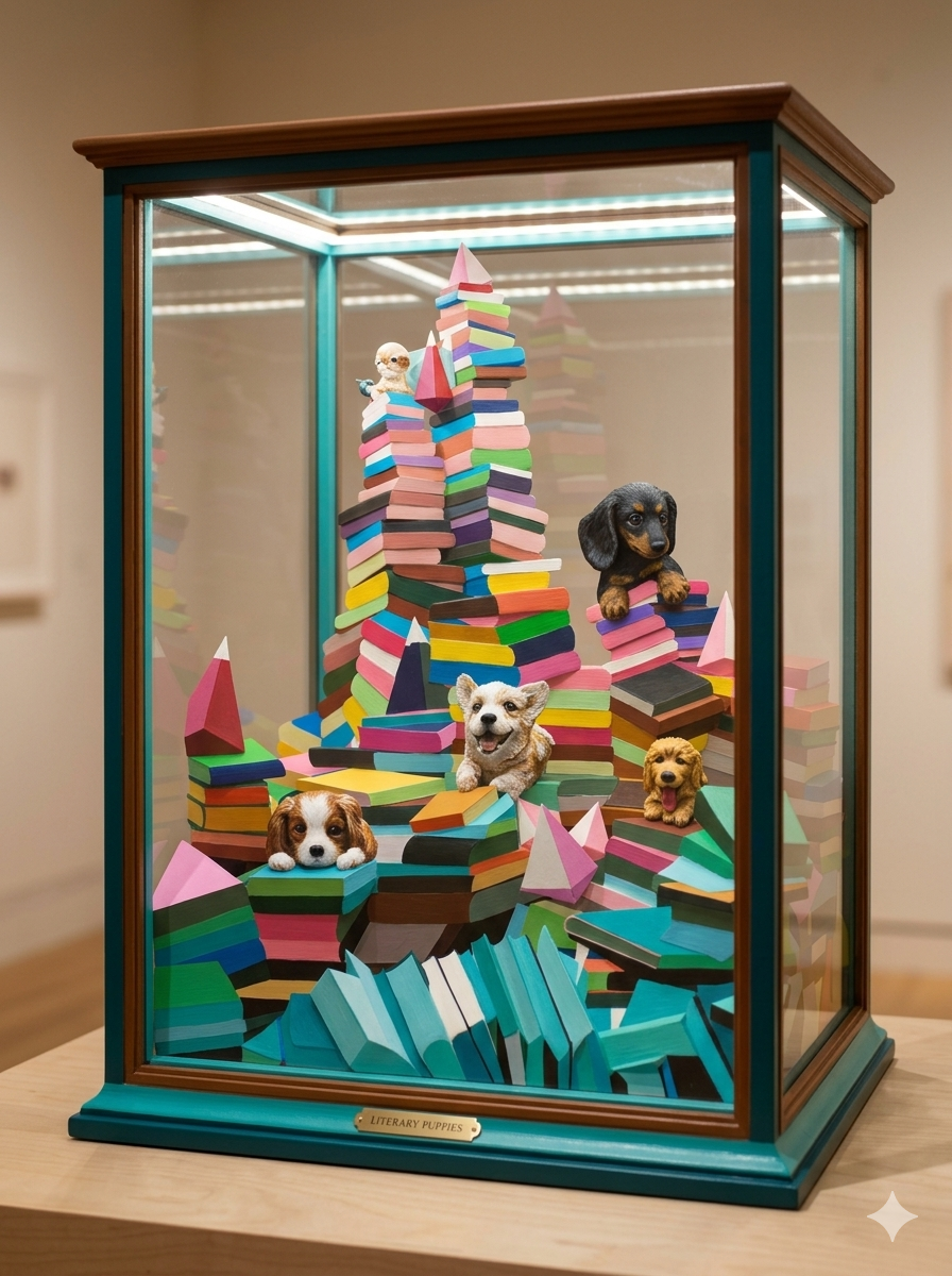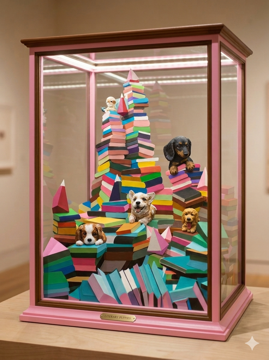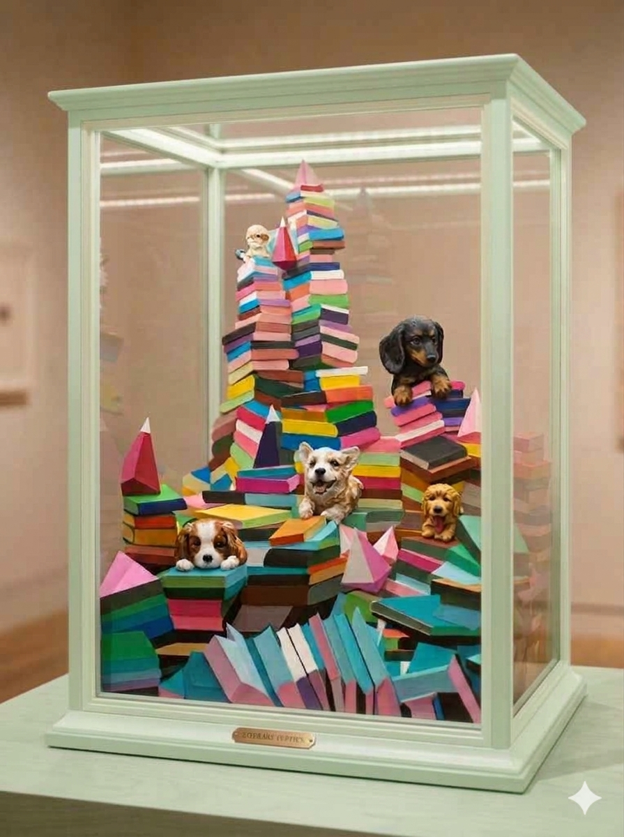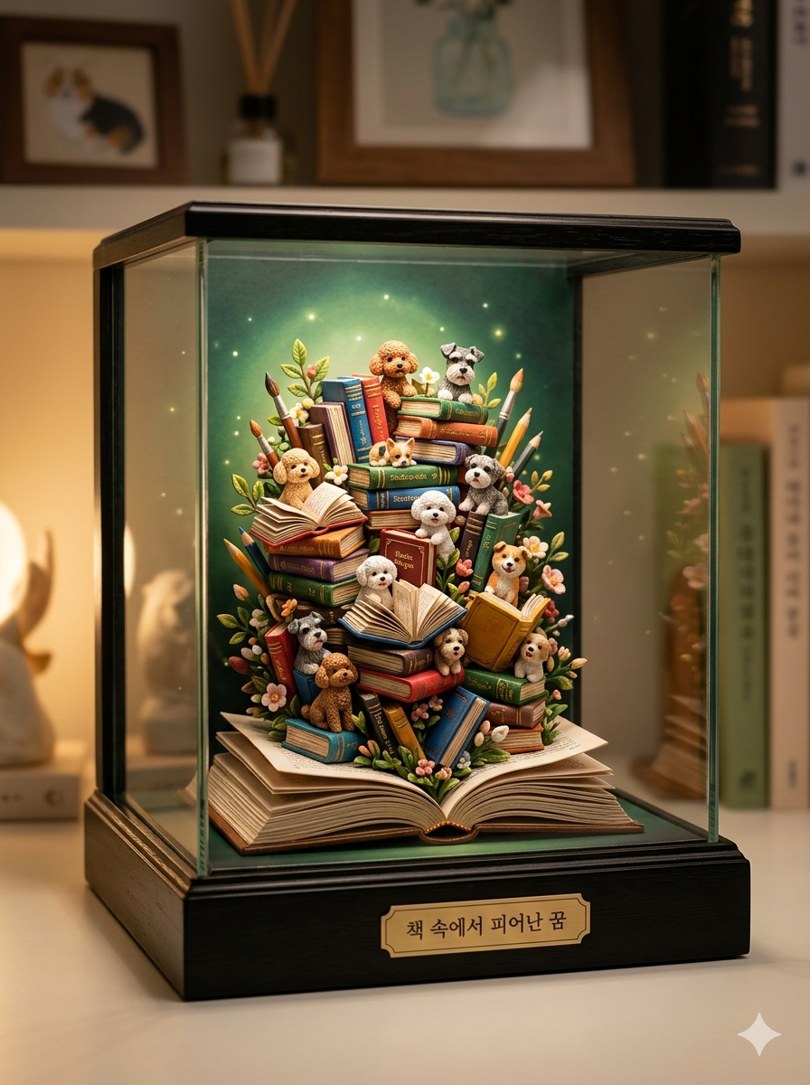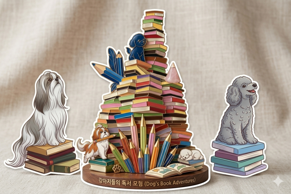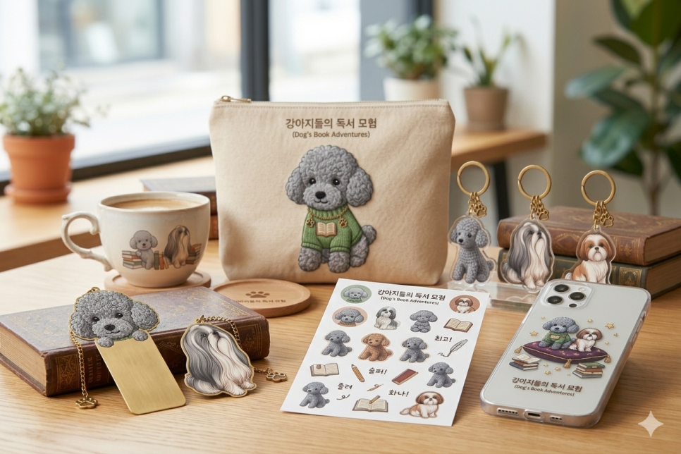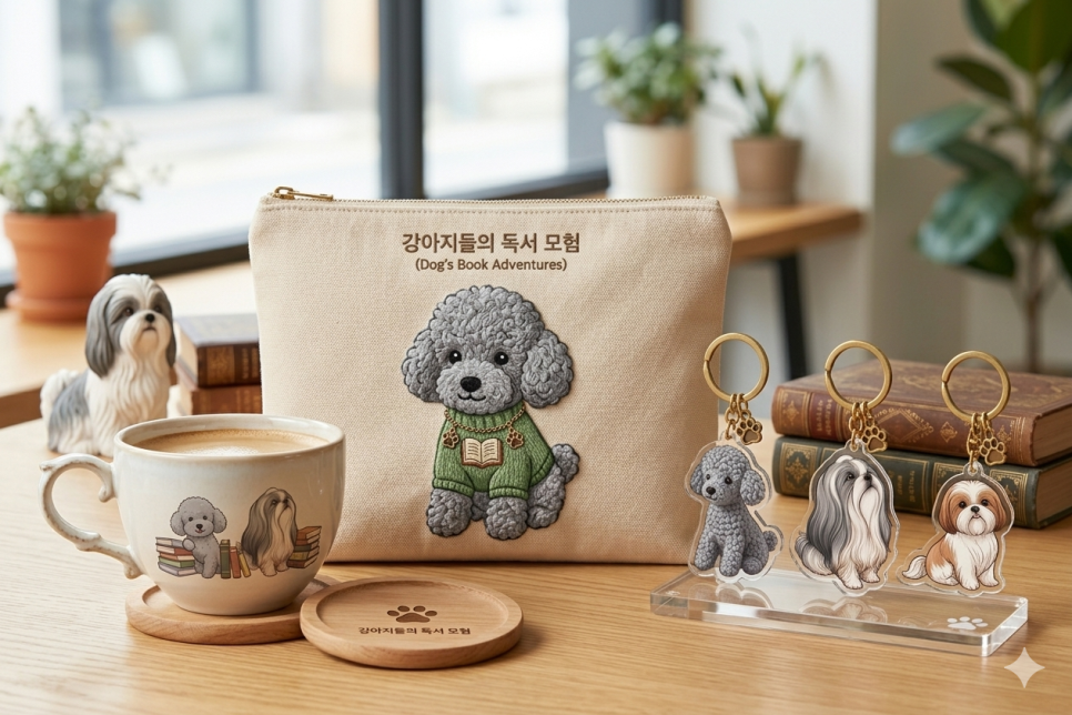 통일감 유지: 현재 이미지처럼 '책(도서)'이라는 소재와 시추를 연결하면 '독서하는 강아지'라는 명확한 브랜드 컨셉이 생겨 팬들에게 더 깊은 인상을 줄 수 있습니다.