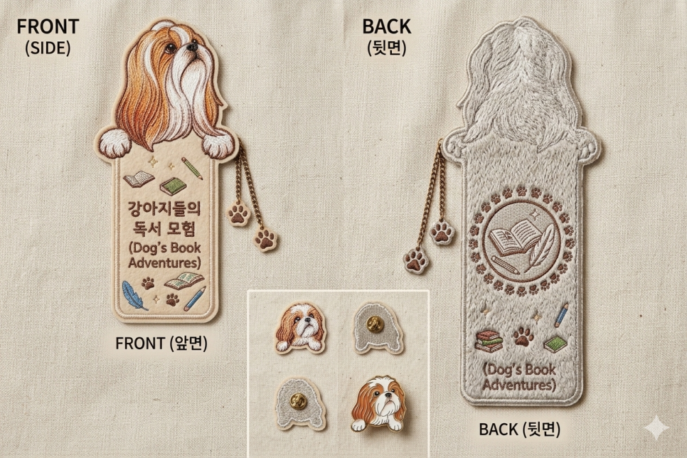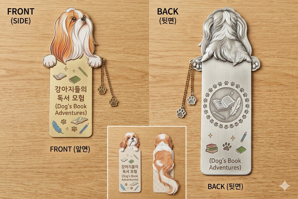 북마크 (책갈피): 이미지의 컨셉을 살려, 책 위로 시추의 얼굴이나 꼬리가 살짝 튀어나오는 디자인의 금속 또는 종이 북마크를 추천합니다.