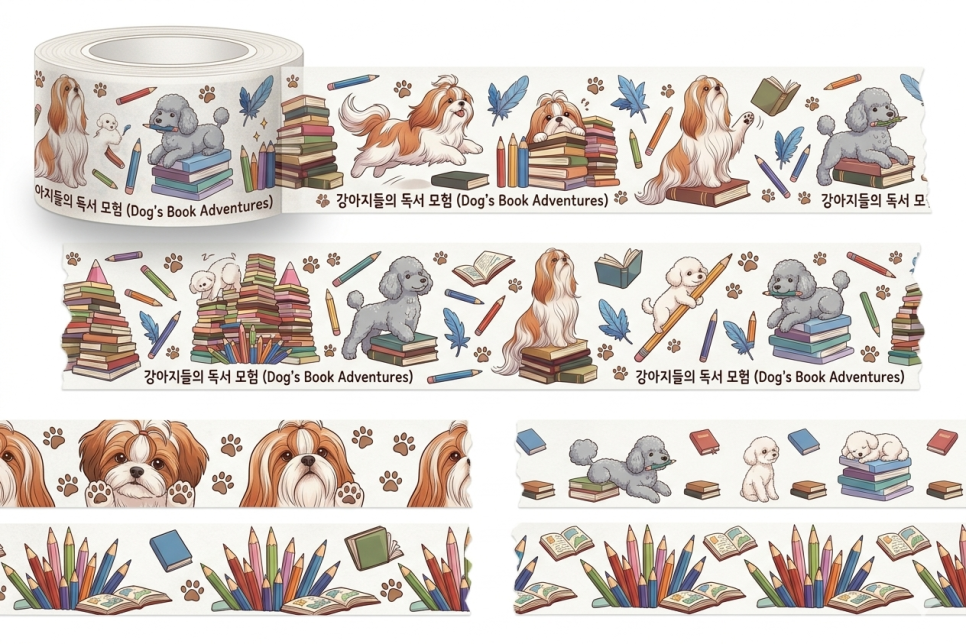 다이어리 마스킹 테이프: 시추가 책 사이사이를 뛰어다니거나 고개를 들고 있는 다양한 포즈를 반복 패턴으로 제작해 보세요.