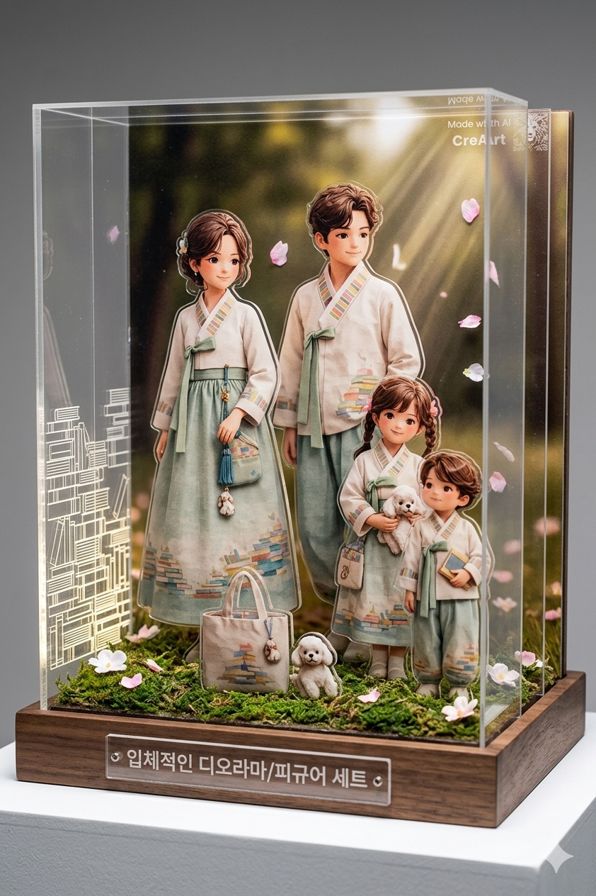 입체적인 디오라마/피규어 세트: 이미지 자체가 정교한 피규어 같은 느낌을 줍니다. 이 이미지를 바탕으로 실제 3D 피규어 세트를 제작하거나, 투명 아크릴 레이어를 겹쳐서 입체감을 살린 디오라마 스탠드를 만들면 소장 가치가 매우 높을 것입니다.