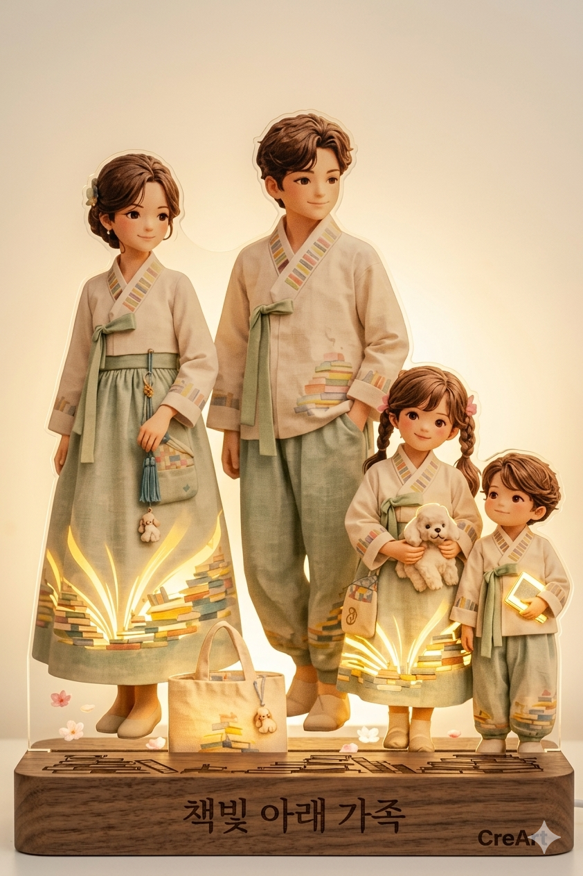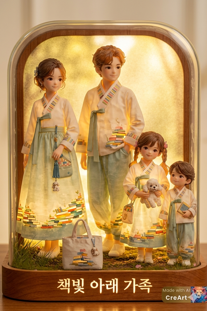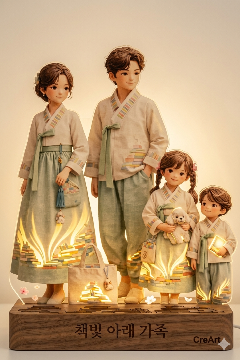 금박/은박 각인: 작품명인 "책빛 아래 가족" 문구에 은은한 샴페인 골드 박을 입히면 프리미엄 굿즈의 느낌이 확 살아납니다.