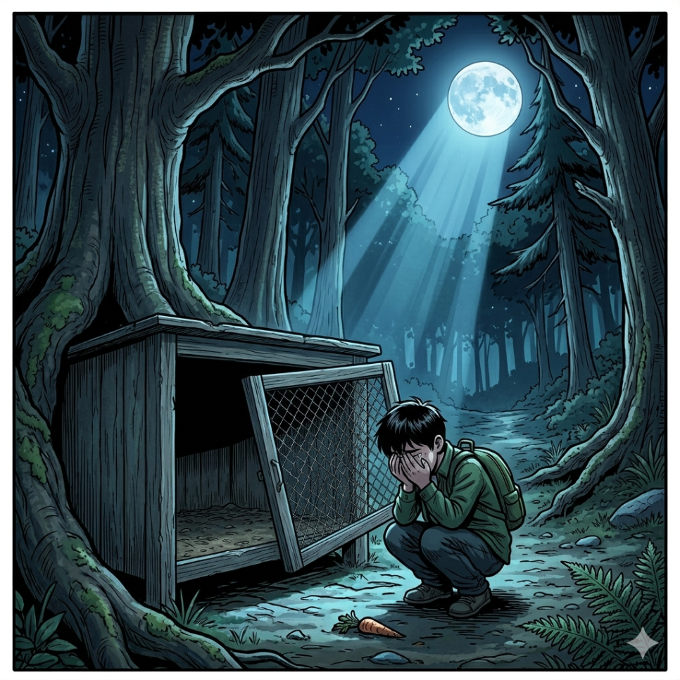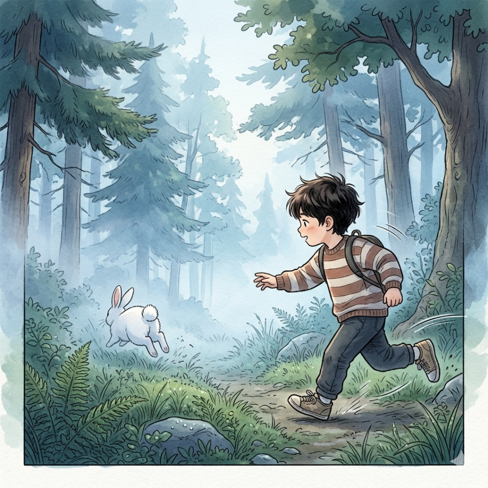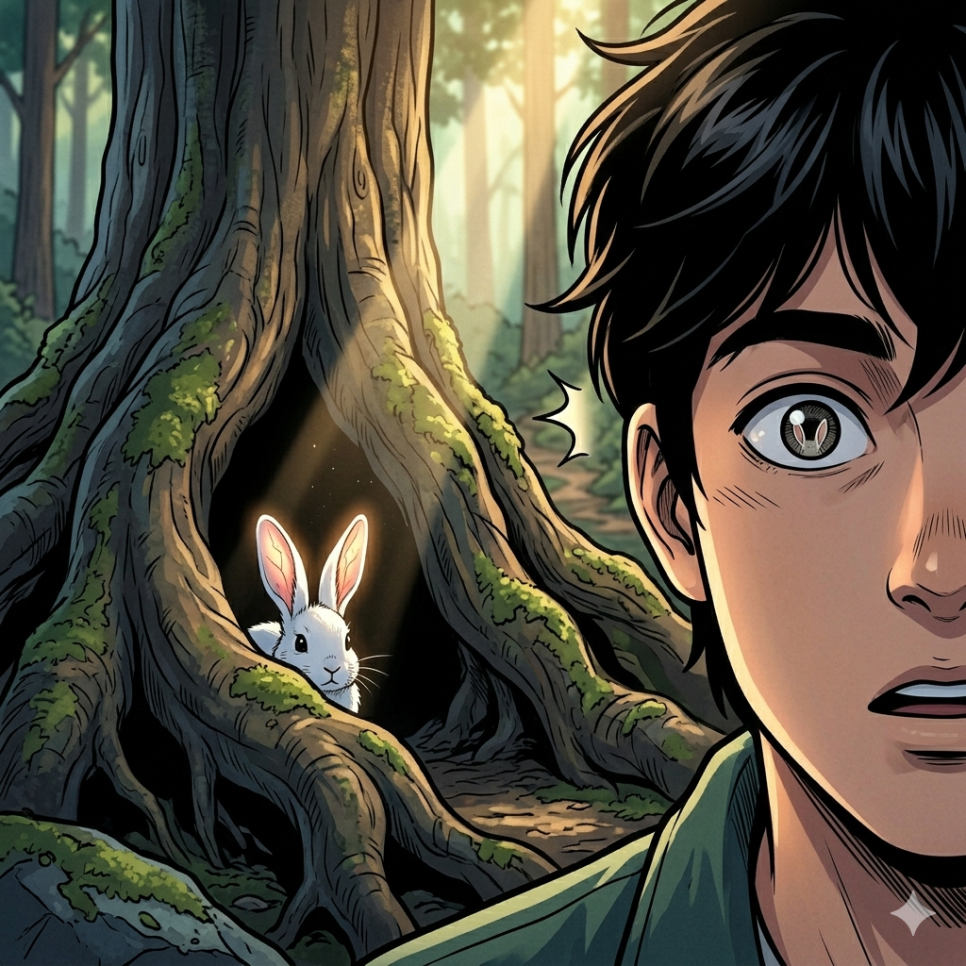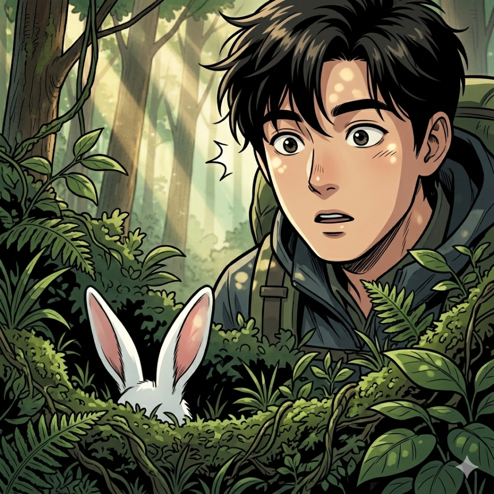 산 중턱에 다다랐을 때였습니다. 바람 소리도, 새소리도 잠시 멈춘 정적 속에서 아주 작고 선명한 소리가 들려왔습니다. '바스락.' 마른 잎을 밟는 그 소리는 분명 자연스러운 바람의 소리가 아니었습니다. 주인공은 숨을 죽이고 소리가 난 곳을 응시했습니다. 커다란 떡갈나무 뒤편, 짙은 초록색 수풀 사이로 무언가 하얗고 긴 것이 쫑긋 솟아올랐습니다. 심장이 쿵쾅거리기 시작했습니다. 그것은 너무나 익숙한 떨림이었습니다. 어린 시절, 밥을 줄 때마다 반갑게 흔들리던 그 귀와 똑 닮아 있었습니다. 주인공은 마치 마법에 걸린 듯, 홀린 사람처럼 소리 없이 그곳으로 다가갔습니다.