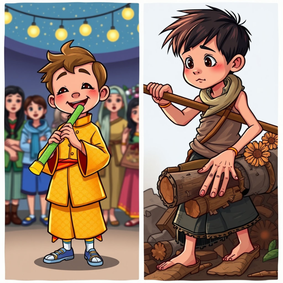 거지가 된 그는 어느 날 비단 옷과 옥피리를 손에 들고 다시 세상에 등장하며, 모두의 눈을 사로잡습니다.