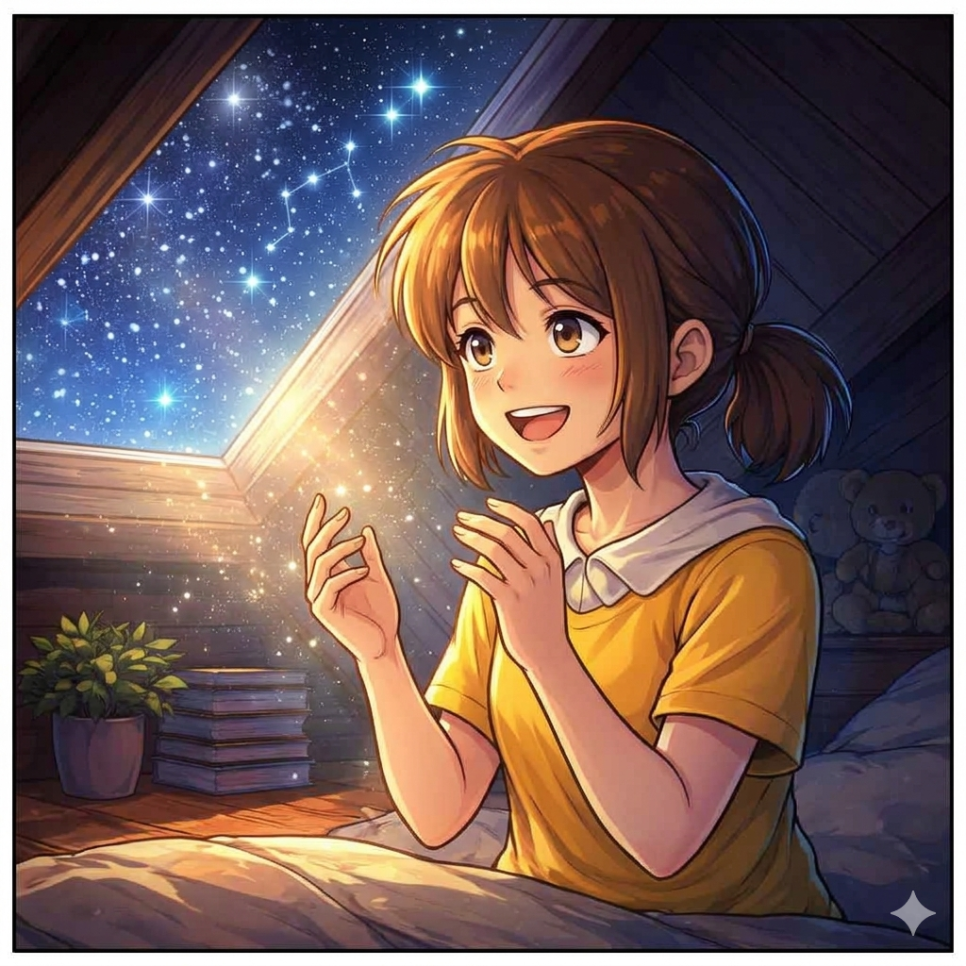 별이는 집에서 가장 작은 다락방을 쓰게 되었어요. 낡은 창문과 삐걱거리는 바닥, 하지만 하늘이 가장 잘 보이는 곳이었어요.