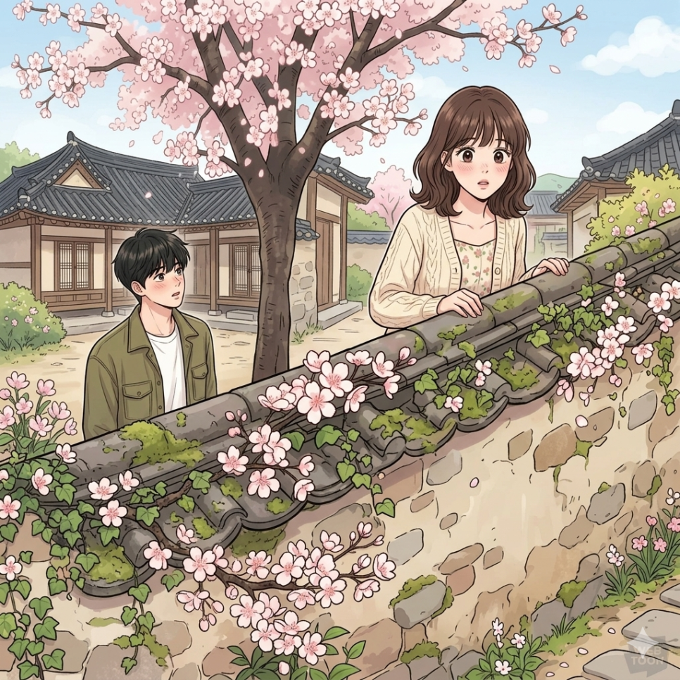 그다음 순간, 소년은 새봄의 팔을 끌고 담장 옆 커다란 나무 뒤로 홱 당겼다.