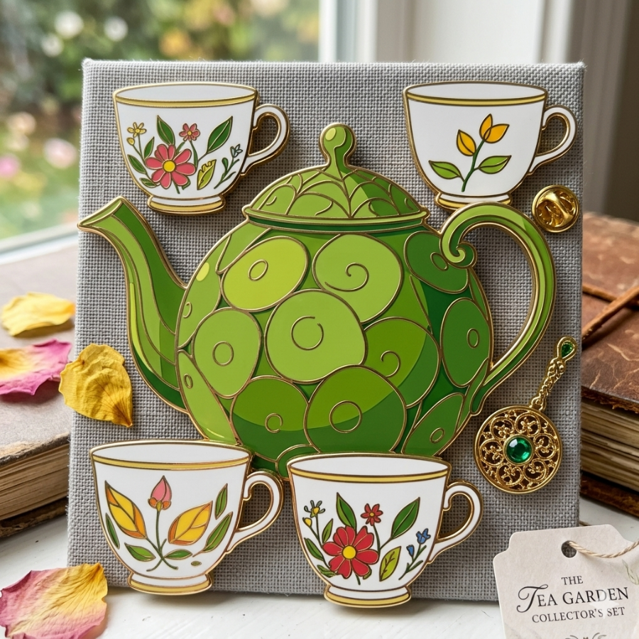 에나멜 핀 배지 (Enamel Pin Badges): 녹색 찻주전자와 각 찻잔의 디자인을 정교한 금속 핀 배지로 제작합니다. 가방이나 옷에 달아 포인트 액세서리로 활용할 수 있습니다.