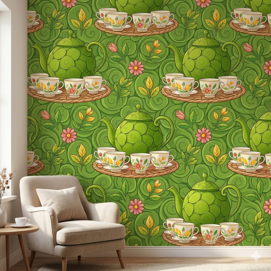 패턴 벽지 (Wallpaper or Wall Decal): 이미지의 핵심 요소인 녹색 찻주전자의 나선형 패턴과 꽃무늬 찻잔들을 재구성하여 벽지로 디자인하면, 포인트 인테리어로 활용도가 매우 높습니다.