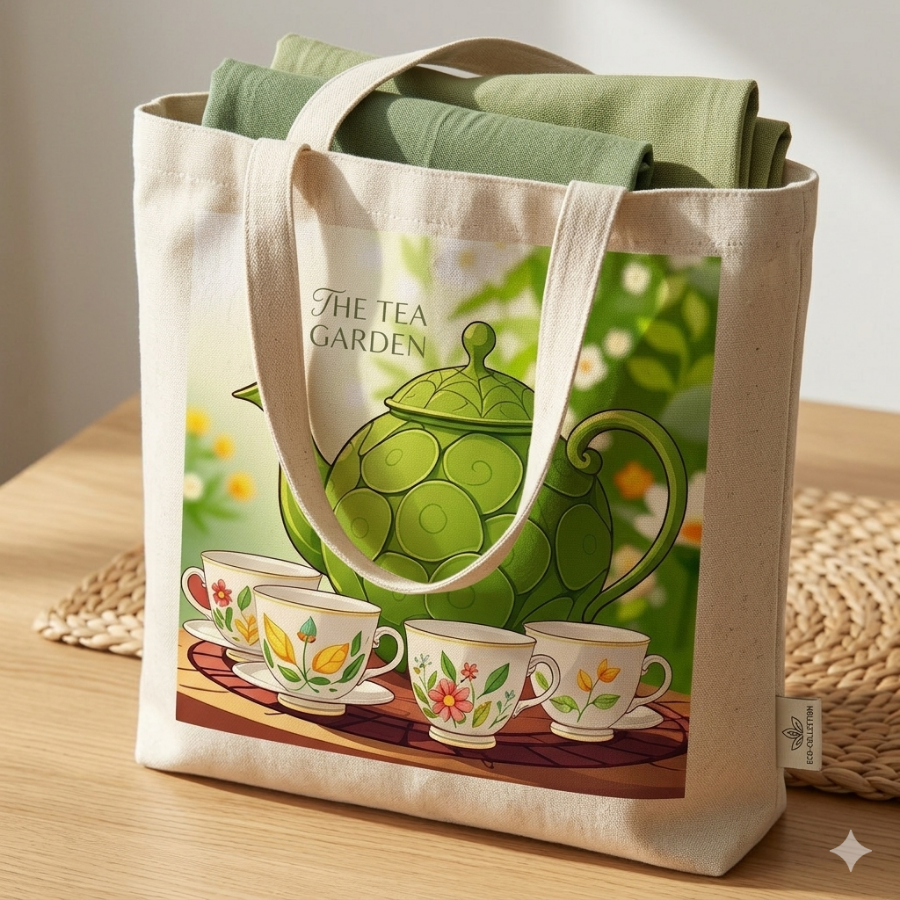 에코백 및 토트백 (Eco-bag & Tote-bag): 이미지 전체를 가방 전면에 크게 인쇄하거나, 핵심적인 찻주전자 디자인을 중앙에 배치합니다.