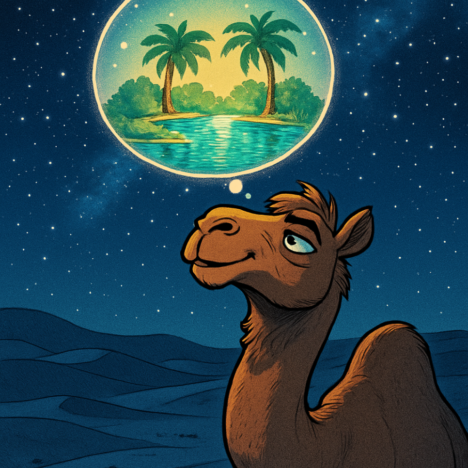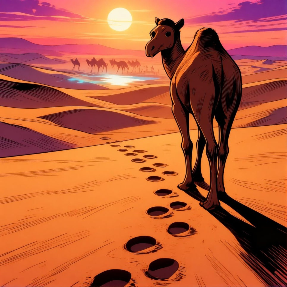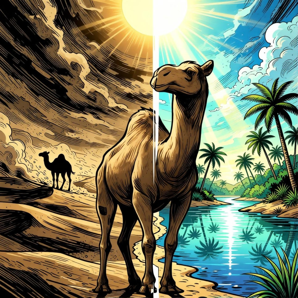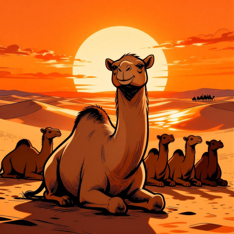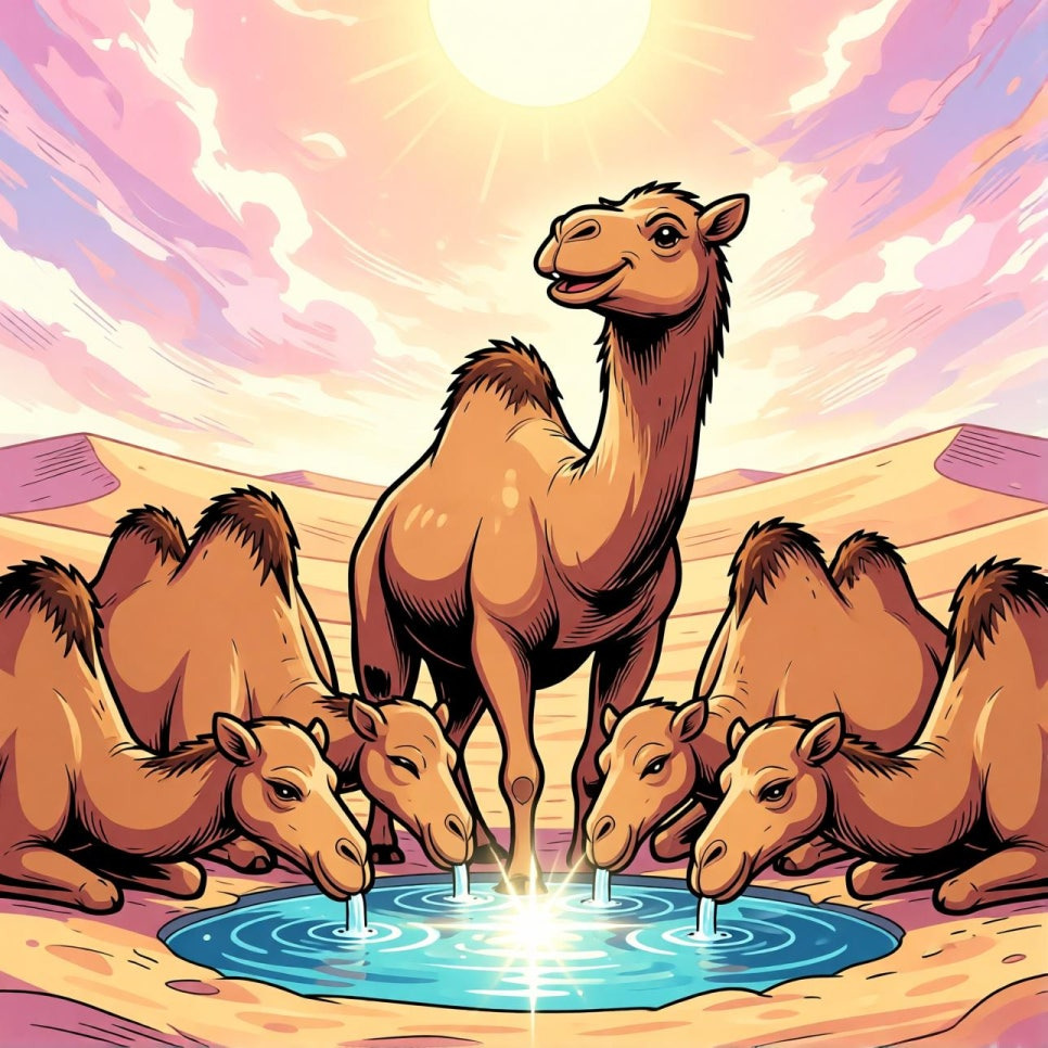 끝이 보이지 않는 넓은 사막 한가운데, 뜨거운 햇빛 아래에서 살아가는 낙타 한 마리가 있었어요. 그의 이름은 카림이었어요. 카림은 튼튼한 다리와 긴 목을 가진 멋진 낙타였지만, 한 가지 문제가 있었어요. 바로 욕심이 아주 많다는 것이었죠. 다른 낙타들이 물을 조금씩 나누어 마실 때에도 카림은 항상 더 많이 마시려고 했어요. 풀을 먹을 때도 마찬가지였어요. 친구들이 함께 먹자고 하면, 카림은 몰래 더 많은 풀을 차지하려고 했답니다.