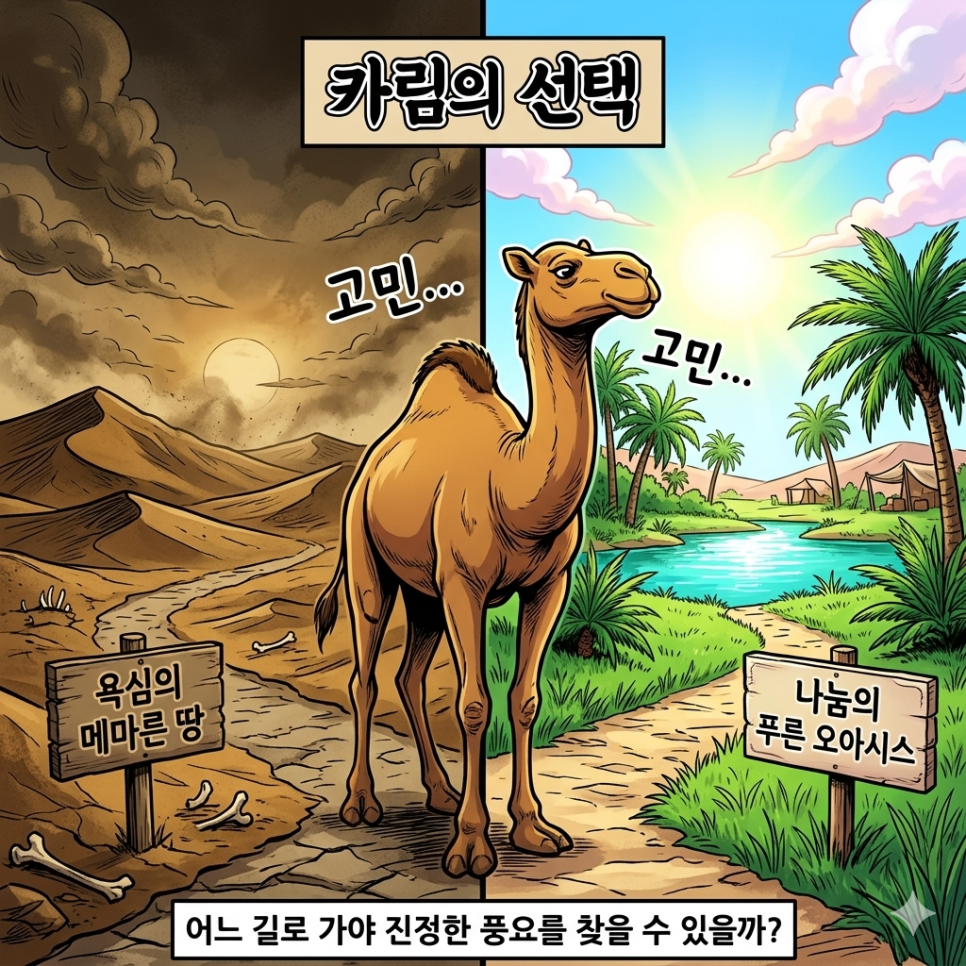 뜨거운 햇빛이 내리쬐는 끝없는 사막. 그곳에는 수많은 동물들이 서로 의지하며 살아가고 있습니다. 하지만 그들 가운데 ‘카림’이라는 낙타는 조금 달랐습니다. 카림은 힘도 세고 누구보다 잘 버티는 낙타였지만, 늘 더 많이 가지려는 욕심을 가지고 있었습니다. 물을 마실 때도, 먹이를 먹을 때도 그는 친구들을 밀어내고 먼저 차지하려 했습니다. 그 결과, 친구들은 하나둘씩 카림 곁을 떠나게 됩니다.