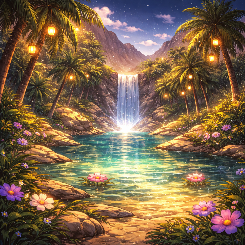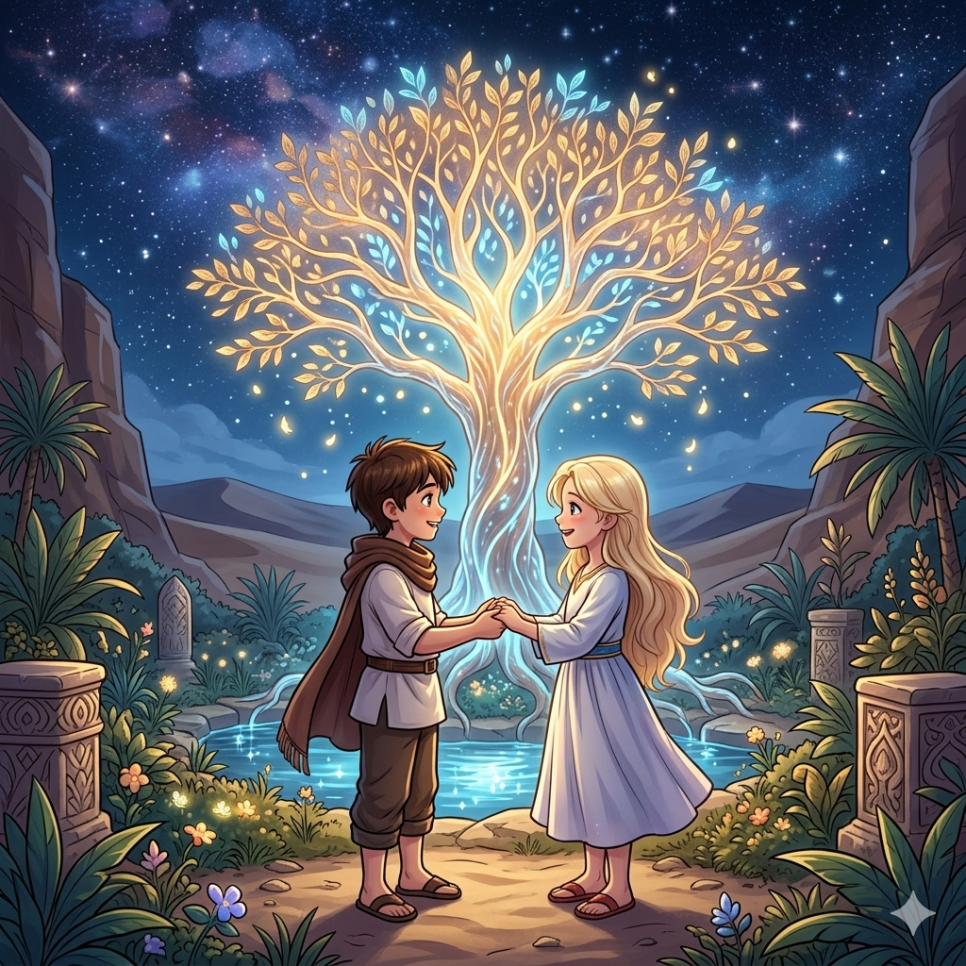 긴 여정 끝에, 둘은 놀라운 곳에 도착했어요. 사막 한가운데에 푸른 나무와 맑은 물이 흐르는 정원이 있었지요.