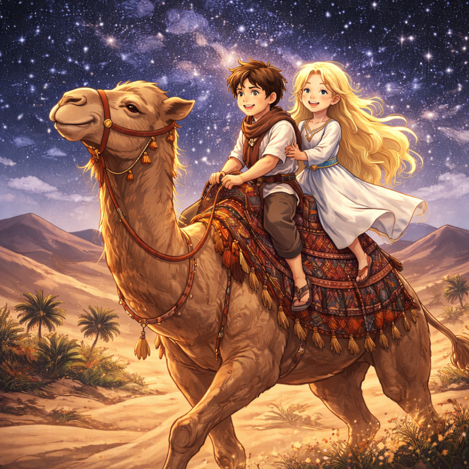 둘은 별과 낙타를 따라 사막 깊은 곳으로 향했어요.