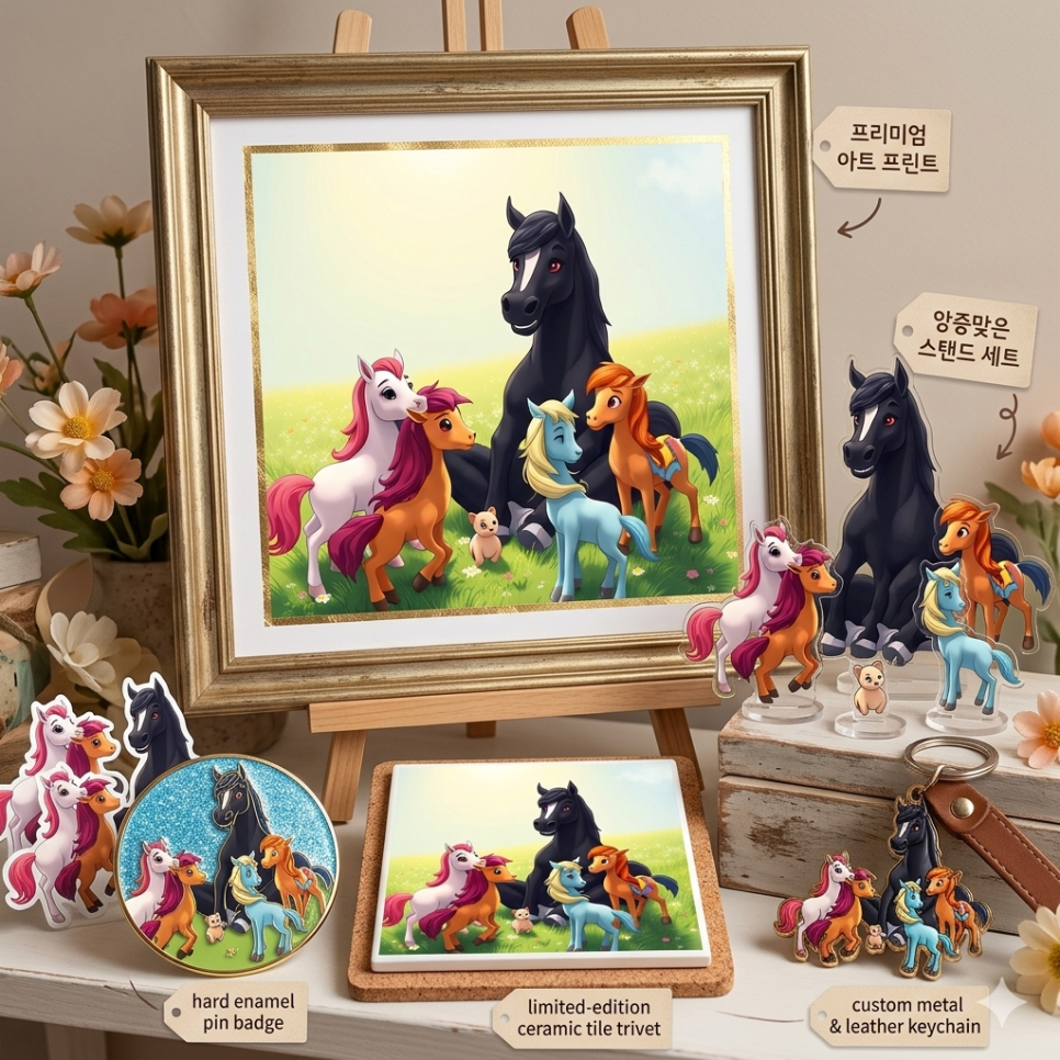 이 포근하고 화사한 이미지의 매력을 가장 잘 살릴 수 있는 굿즈들을 몇 가지 추천해 드릴게요! 캐릭터들이 뚜렷하고 색감이 밝아서 실물로 만들었을 때 정말 예쁠 것 같아요.
