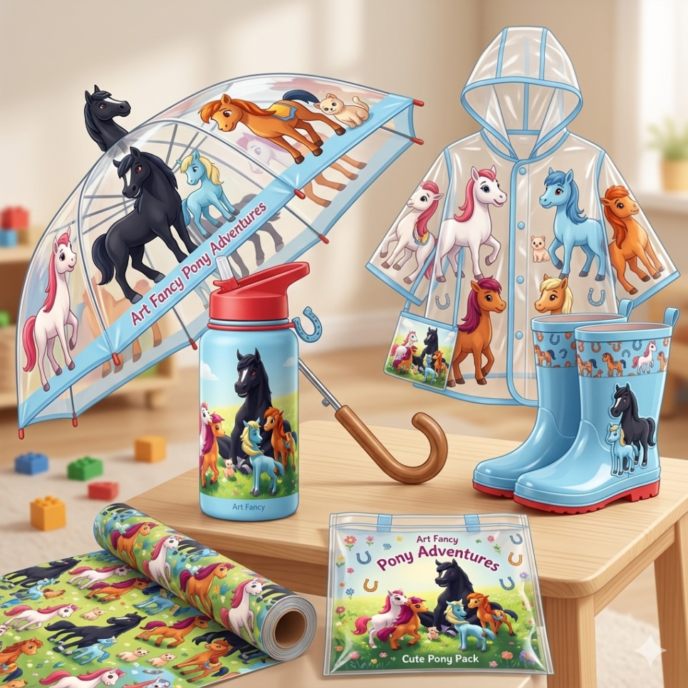 어린이 물통. 귀여운 어린이 우산. 우비와 장화세트. 포장지. 비닐에코백