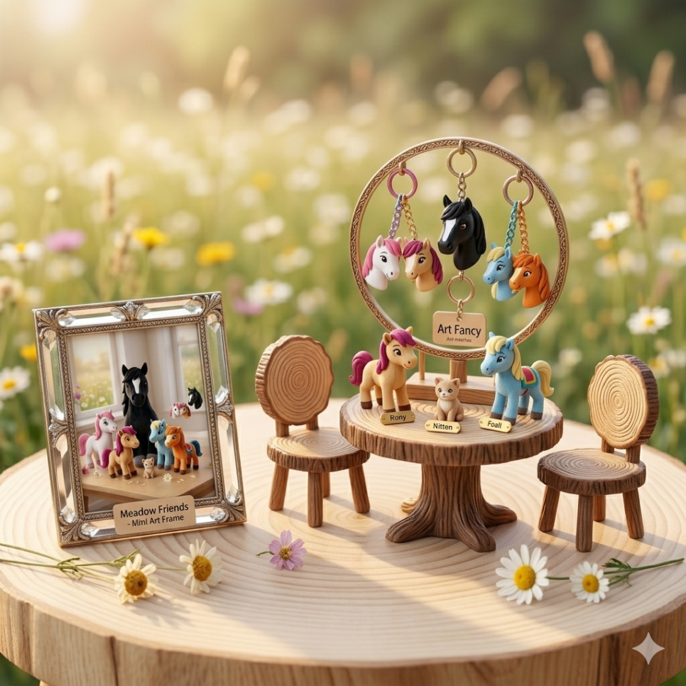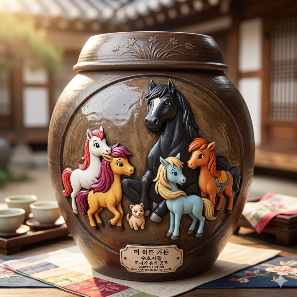 귀여운 말 캐릭터들을 활용하여, 한국의 전통적인 옹기와 현대적인 도자기의 매력을 결합한 아트 상품 굿즈 세트