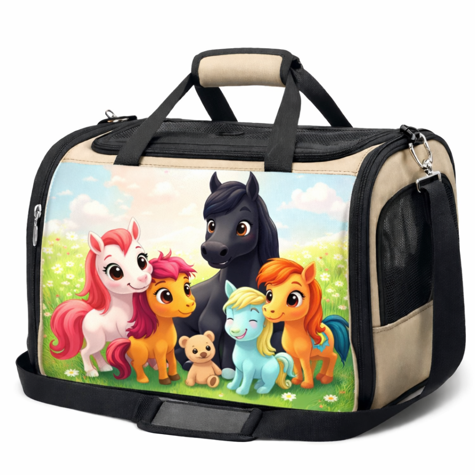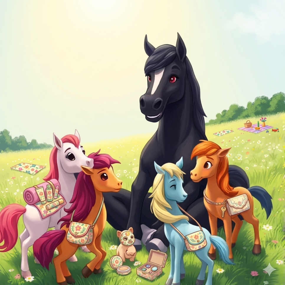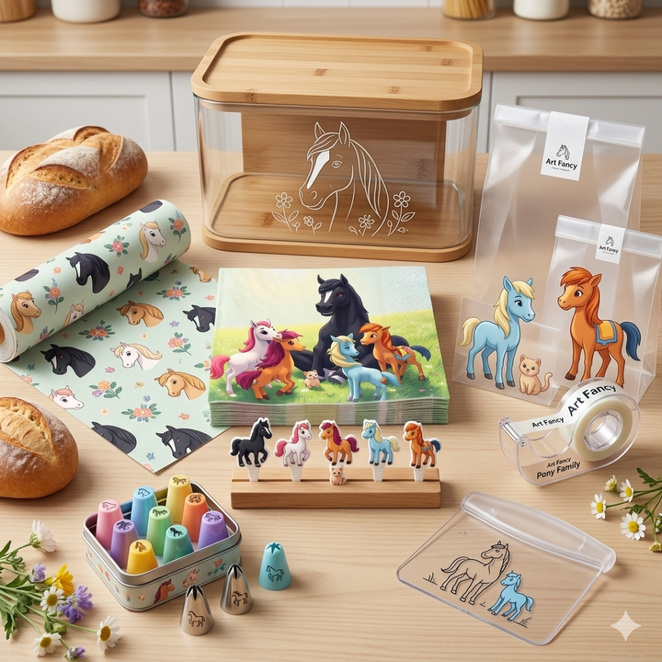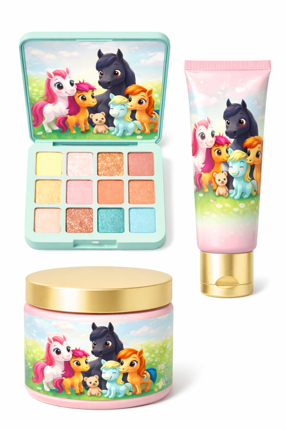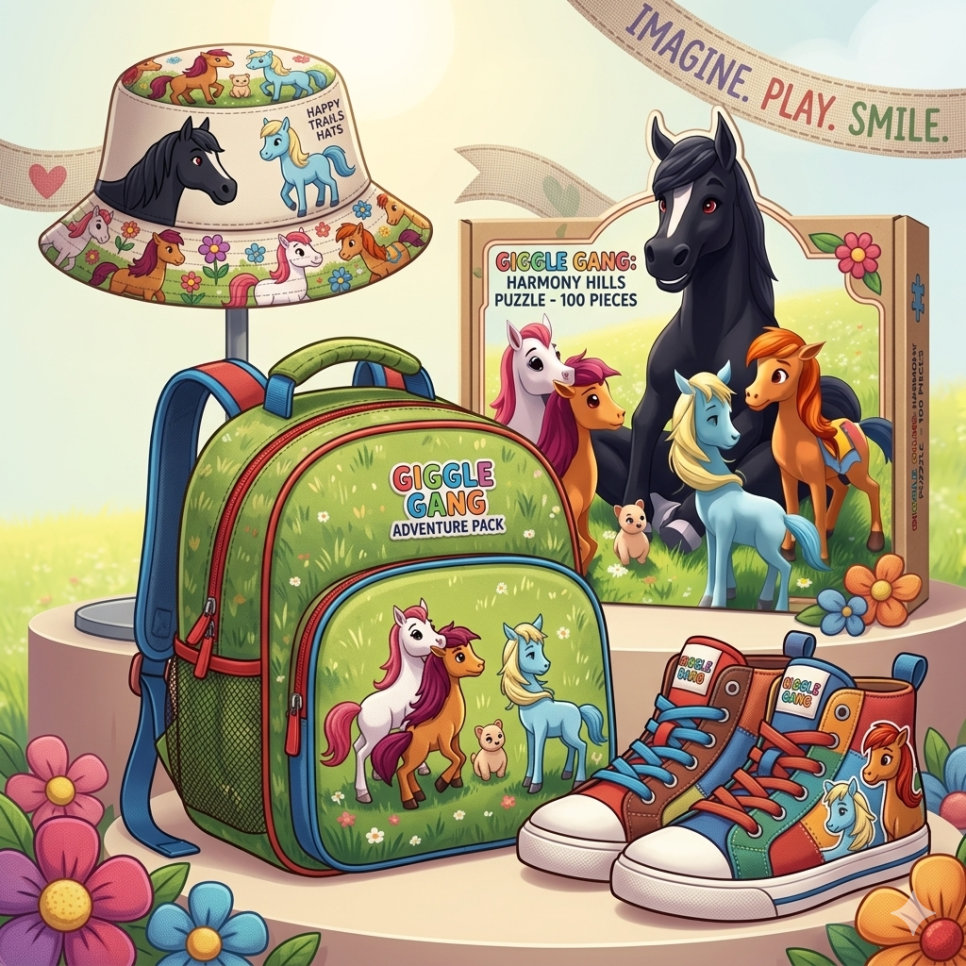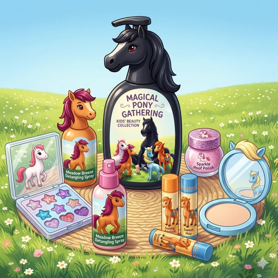 귀여운 말 캐릭터들을 테마로 한 아동용 패션 아이템, 놀이 용품, 그리고 식품 패키지 세트