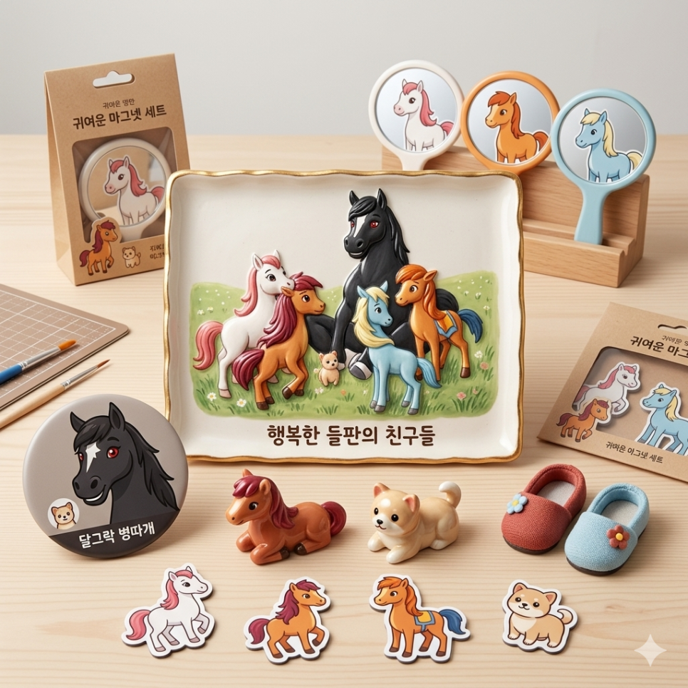 말 캐릭터들의 귀여운 매력을 가득 담아 디자인한 도자기 굿즈와 실용적인 생활 소품 세트