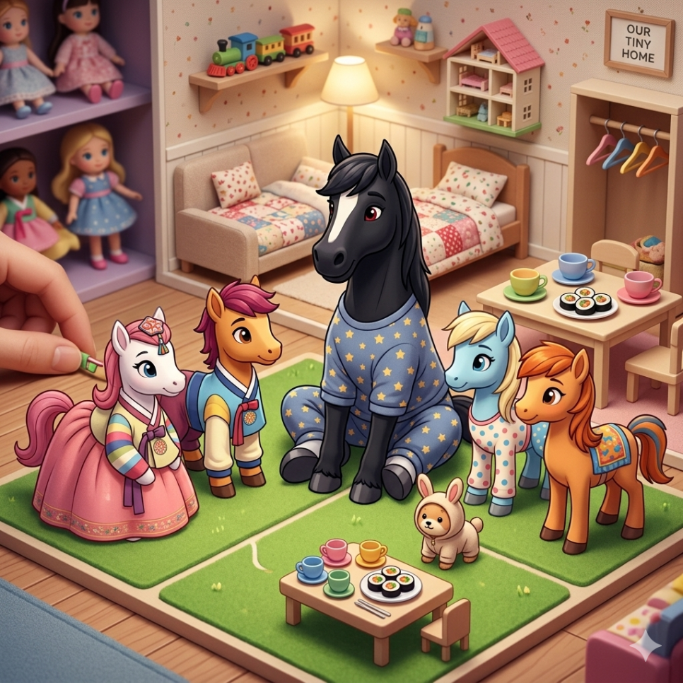 말 캐릭터들을 테마로 한 어린이 잠옷, 한복, 그리고 미니어처 놀이집(인형의 집) 세트