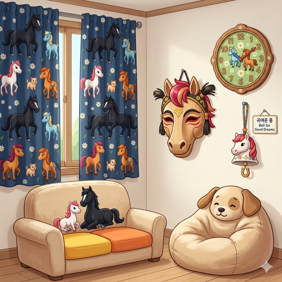 벽면 장식: 캐릭터를 한국의 전통적인 미와 결합한 탈 형태의 벽 장식과, 캐릭터의 갈기 모양을 프레임으로 활용한 벽거울, 그리고 시간마다 귀여운 캐릭터 아이콘이 있는 벽시계로 벽면을 생동감 있게 꾸몄습니다.