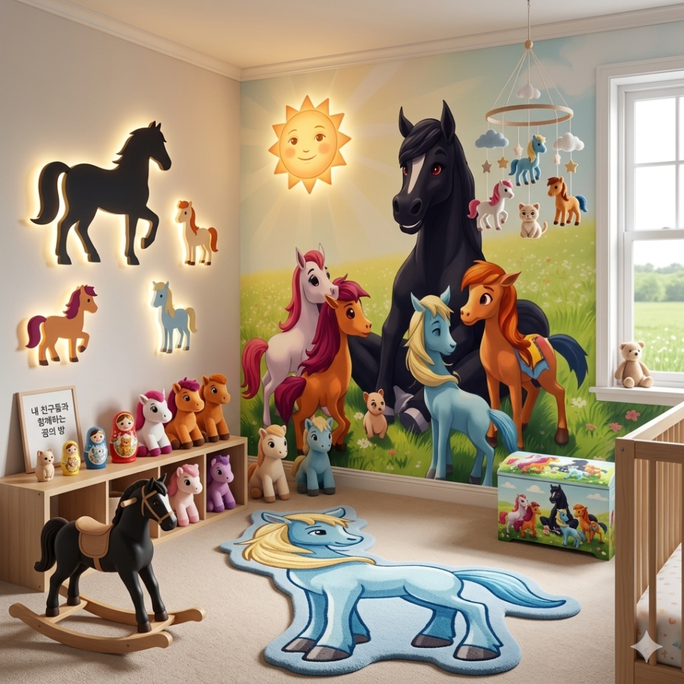 인테리어 소품: 캐릭터들이 평화롭게 노니는 초원을 벽 전체에 옮겨 놓은 듯한 뮤럴 벽지와, 방의 분위기를 따뜻하게 밝혀주는 캐릭터 쉐이드 조명입니다. 바닥에는 아이들이 위에서 안전하게 놀 수 있는 폭신한 캐릭터 원형 카펫을 배치했습니다.