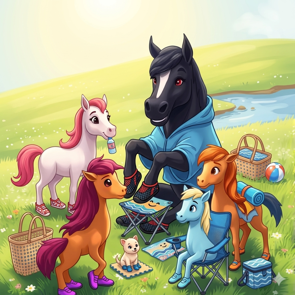 놀이 용품: 말 캐릭터의 부드러운 질감을 살린 봉제 인형과, 초원을 배경으로 캐릭터들이 모여 있는 퍼즐 세트입니다.