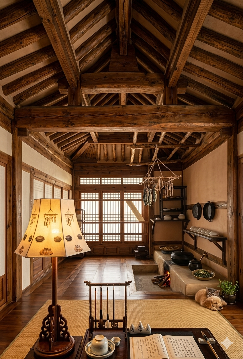 전략: 그림 속 어두운 목재 들보나 전통 가구와 어울리는 짙은 월넛(Hearth Walnut)이나 고재(Reclaimed Wood) 느낌의 원목 프레임을 사용합니다.