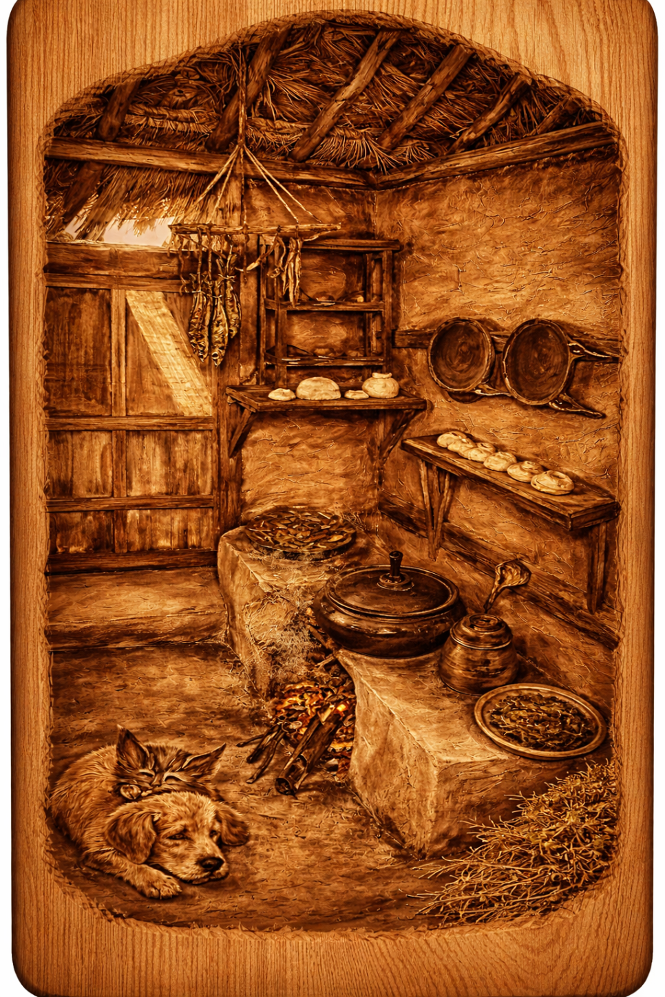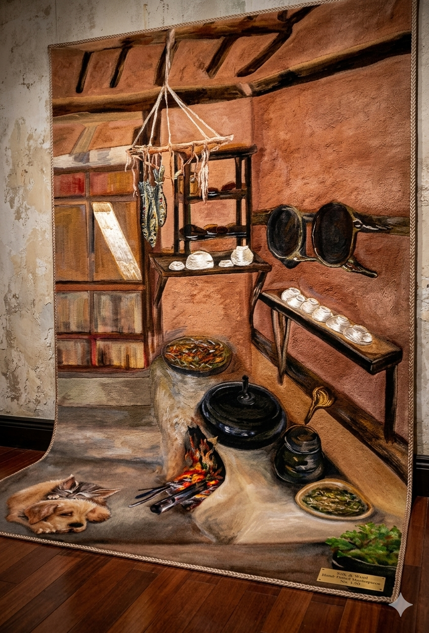 고급화 포인트: 아궁이의 불꽃이나 걸려있는 생선 같은 세부 요소는 광택이 나는 실크로 표현하여 입체감을 주고, 나머지 부분은 무광의 부드러운 울로 처리합니다. 벽에 걸 수도 있고 바닥에 깔 수도 있는 예술 작품으로 포지셔닝합니다.
