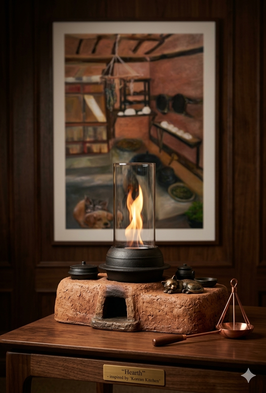 전략: 그림 속 아궁이와 가마솥에서 영감을 받아, 에탄올을 연료로 사용하는 현대적인 실내용 테이블탑 파이어 핏을 디자인합니다.
