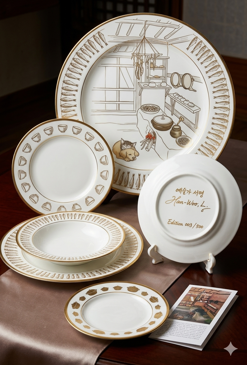 고급화 포인트: 테두리에 24K 골드 림(Gold Rim) 마감을 더하고, 바닥에 작가의 서명과 한정판 번호를 넣어 가치를 높입니다.