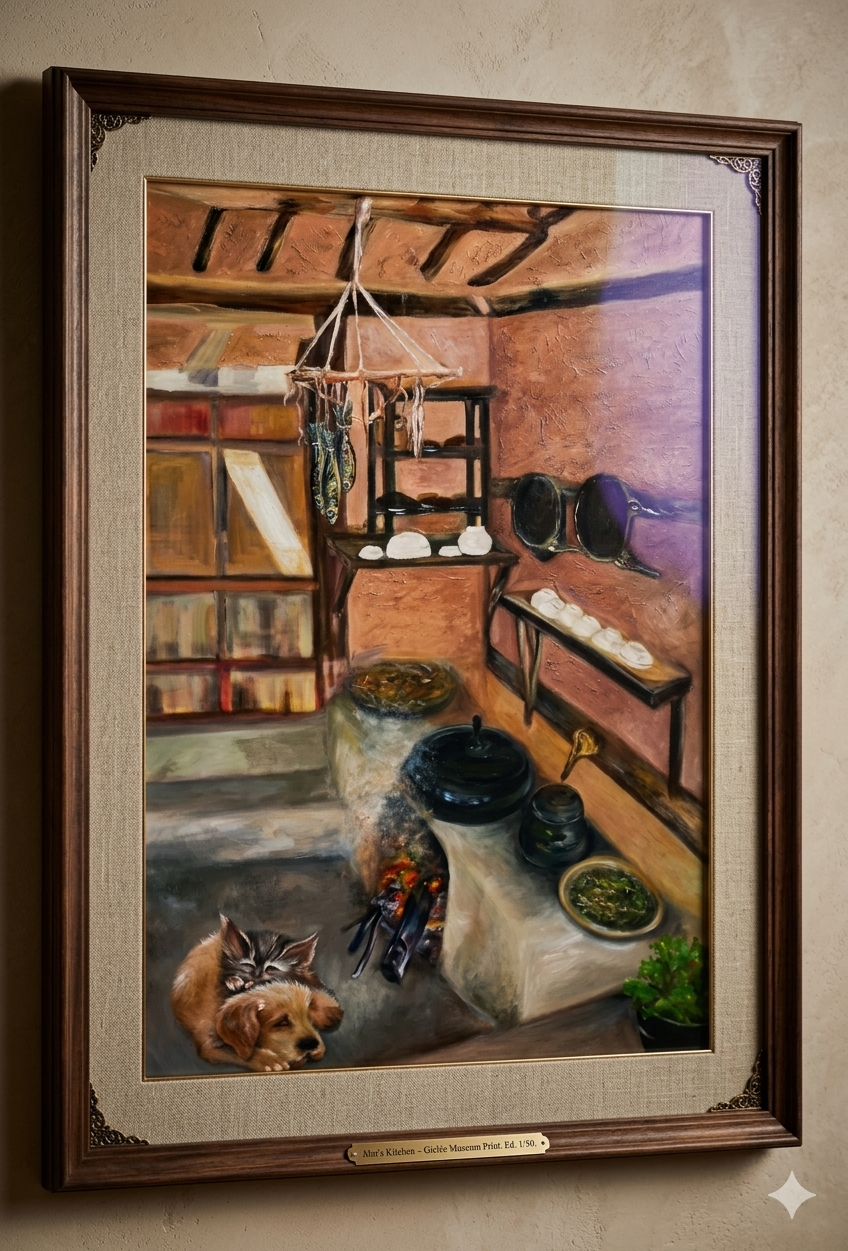 한국의 전통적인 주방 풍경을 아주 따뜻하고 정감 있게 담아낸 훌륭한 회화 작품입니다. 이 그림은 그 자체로도 충분히 아름답지만, 이를 '품격 있고 고급스러운 아트 상품'으로 재탄생시키기 위해서는 몇 가지 전문적인 접근이 필요합니다.