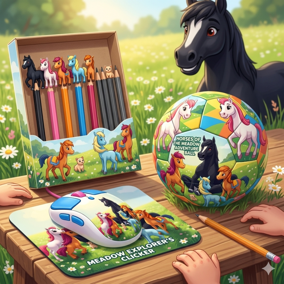 말 캐릭터 테마의 어린이용 공, 컴퓨터 마우스, 그리고 아트 연필 세트 이미지