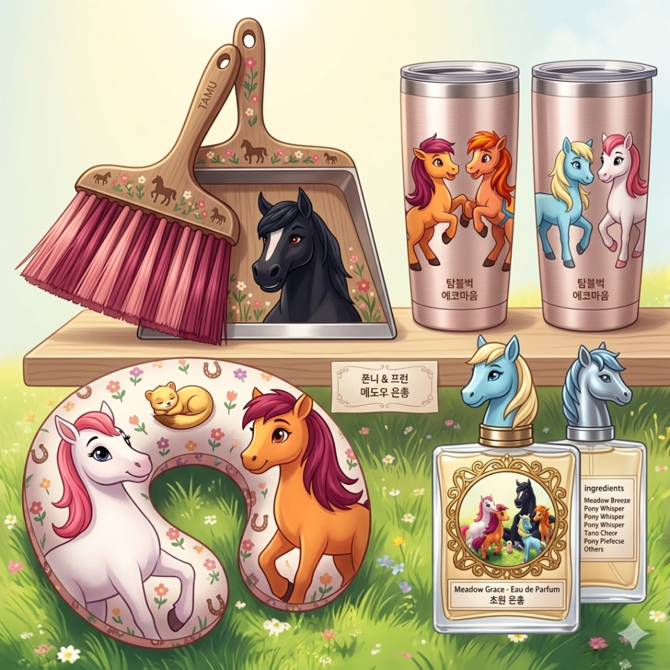 보내주신 귀여운 말 캐릭터들을 테마로 한 야외 활동용 굿즈와 인테리어 소품 세트 이미지입니다.