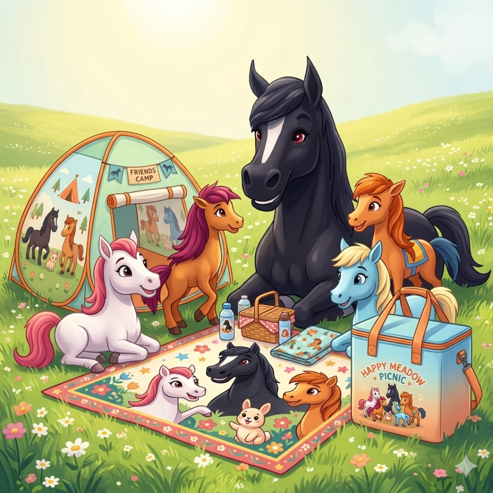 말 캐릭터들을 테마로 한 피크닉 돗자리, 보냉백, 그리고 대형 야외용 텐트 세트 디자인입니다.