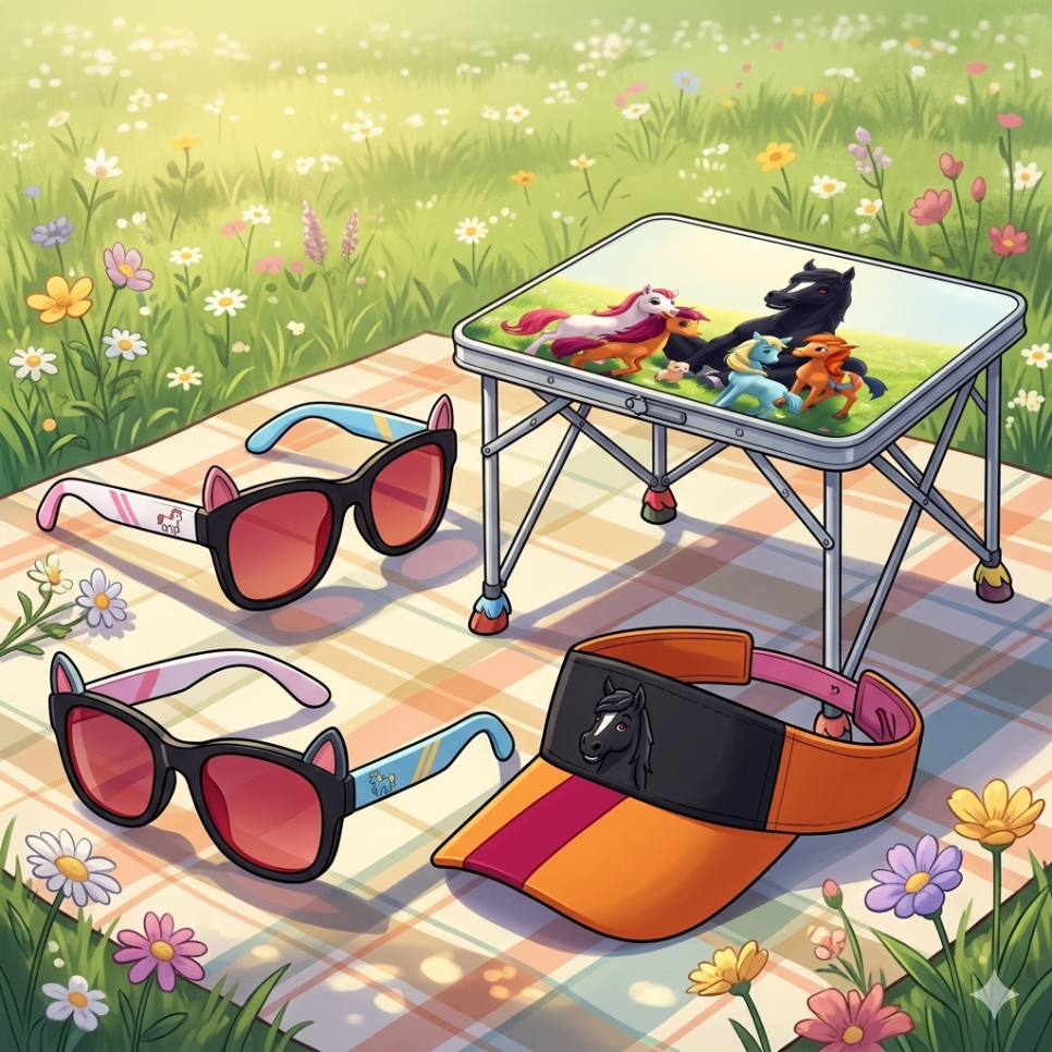 캐릭터 테마의 선글라스, 썬캡(햇빛 가리개 모자), 혹은 야외용 접이식 테이블 디자인이미지 만들어줘