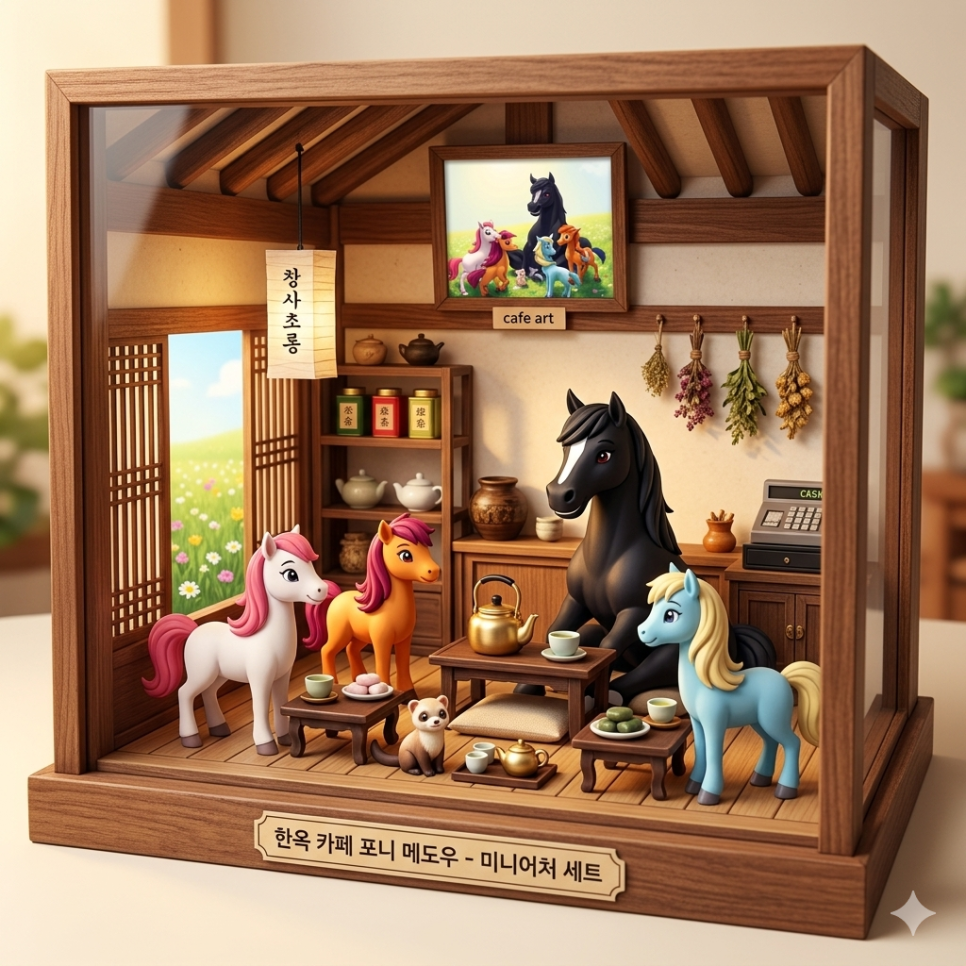 피규어 세트: 정교하게 제작된 작은 말 피규어들은 장식용으로도 훌륭하며, 다른 장난감들과 함께 가지고 놀기 좋습니다.포장박스에 담아서 이쁘게 귀엽게 이미지 만들어줘