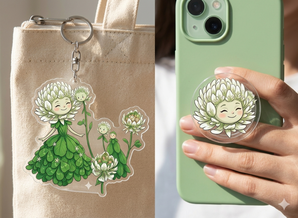 아크릴의 투명함을 살려 청초한 느낌을 더한 키링과, 요정의 미소를 담아 볼 때마다 기분이 좋아지는 스마트톡입니다. 실제 상품으로 제작되었을 때의 느낌을 확인해 보세요!