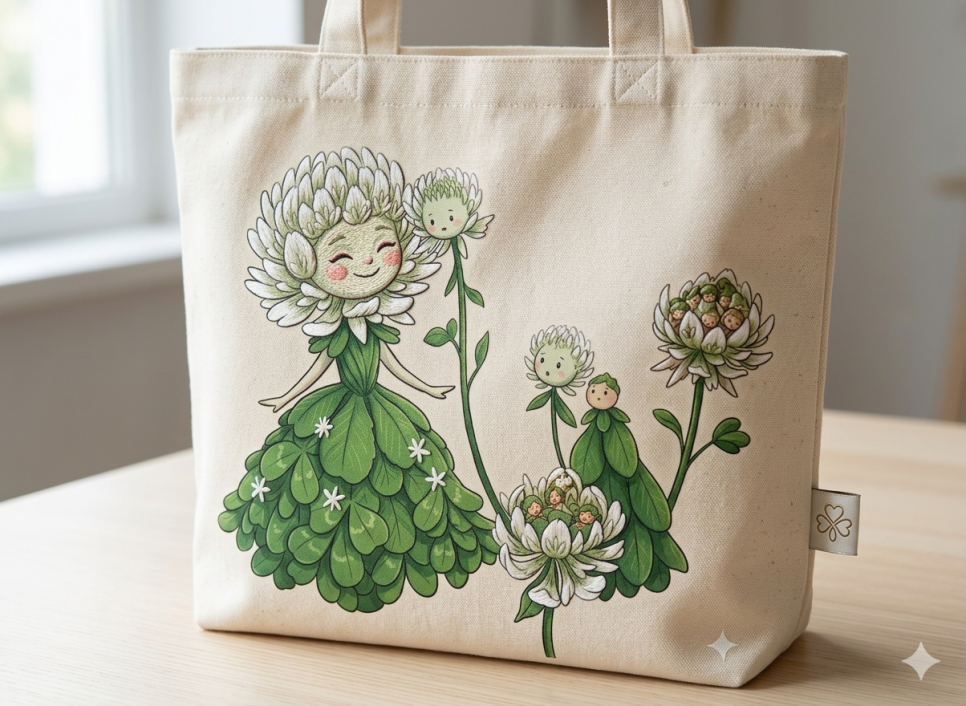 자수 에코백: 전체 이미지를 프린트하거나, 포인트가 되는 요정 캐릭터만 자수로 놓아 에코백을 만들면 고급스러운 느낌을 줄 수 있습니다.