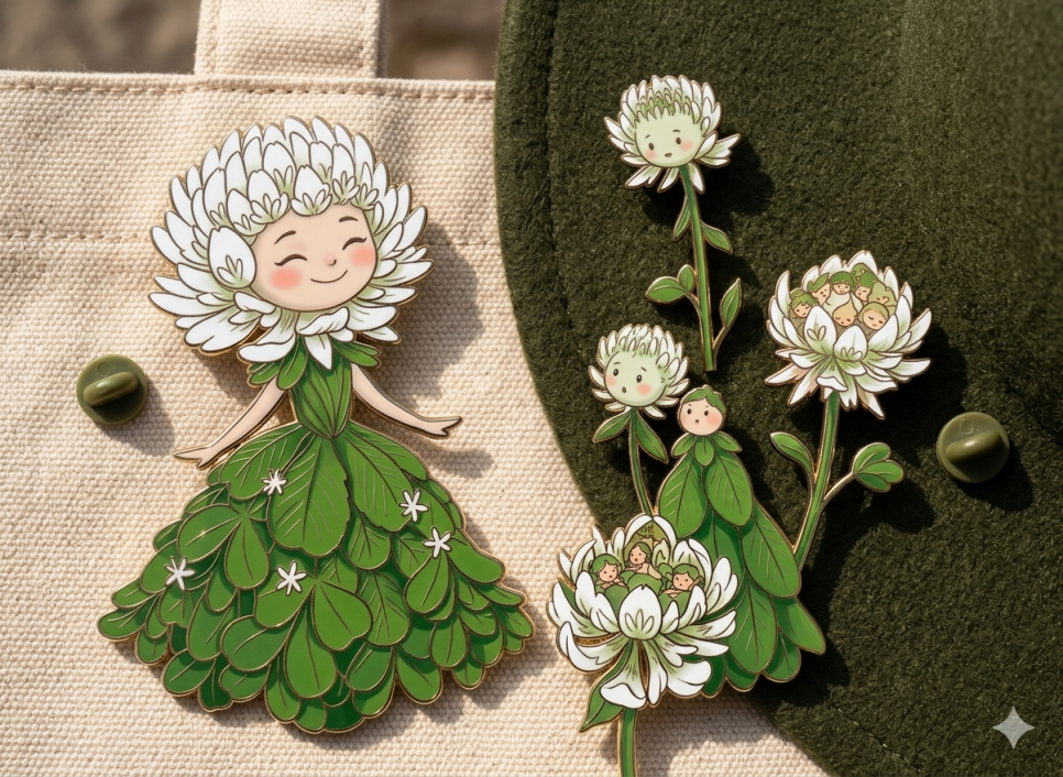 요청하신 내용을 바탕으로, 귀여운 클로버 요정 일러스트를 고급스러운 칠보 뱃지로 변신시켜 보았습니다.
