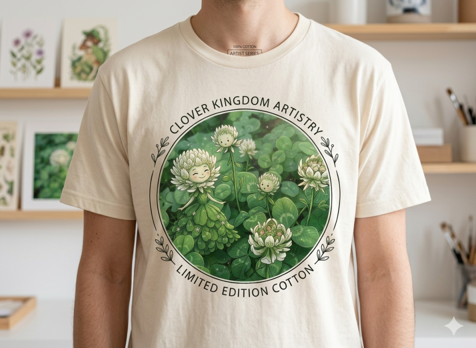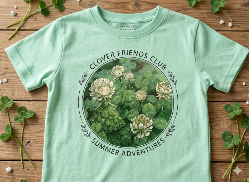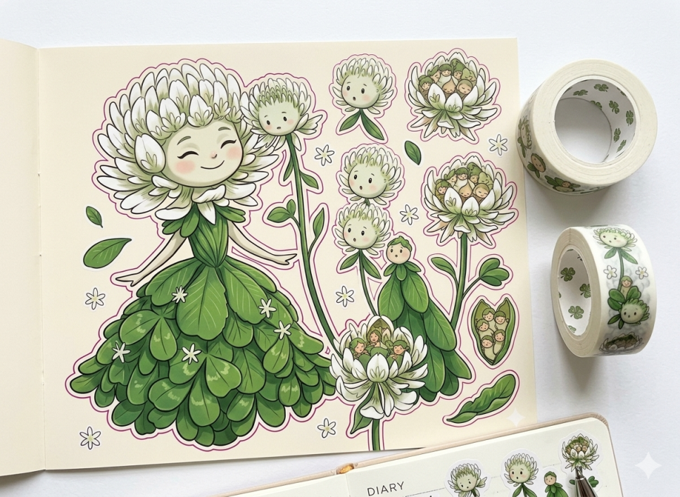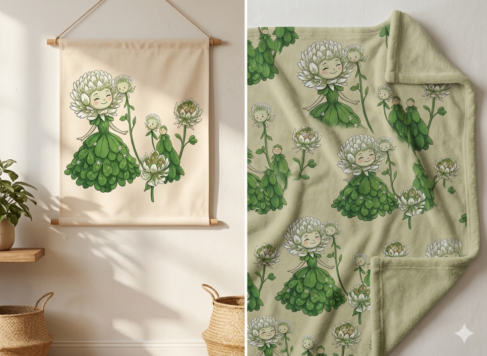 이 이미지는 클로버 요정과 꽃송이들이 어우러진 따뜻하고 동화 같은 분위기가 정말 매력적이네요! 아이들의 순수한 감성을 자극하면서도 디자인이 깔끔해서 다양한 아트 상품으로 제작했을 때 활용도가 높을 것 같습니다.