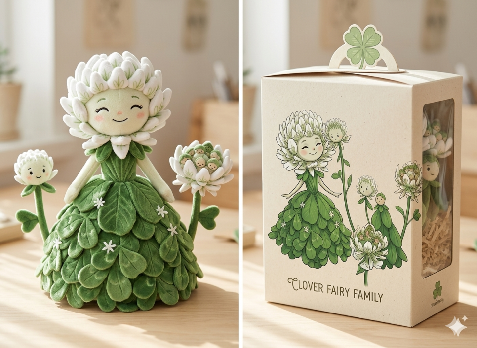 위의 크로버요정 이미지 인형으로 만들어서 포장박스까지 만들어 이미지 만들어줘