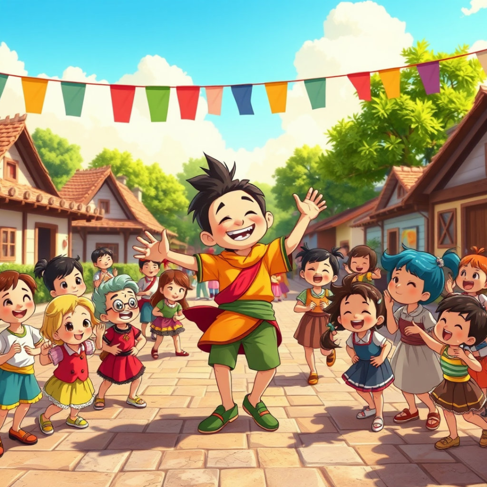마을 광장에서 음악이 울려 퍼졌습니다. “오늘은 춤 대결이야!” 둥글이가 팔을 흔들며 첫 동작을 보여주자, 아이들은 깔깔 웃었어요. 둥글이는 발을 엉뚱하게 꼬기도 하고, 허리를 둥글게 말았다가 휙 풀어내기도 했죠. 아이들도 차례차례 나와서 자기만의 춤을 췄습니다. 춤 실력은 제각각이었지만, 서로를 응원하는 소리와 웃음소리가 마을을 가득 채웠습니다. 그날 이후, 마을에서는 매주 ‘두둠칫 데이’가 열렸답니다.