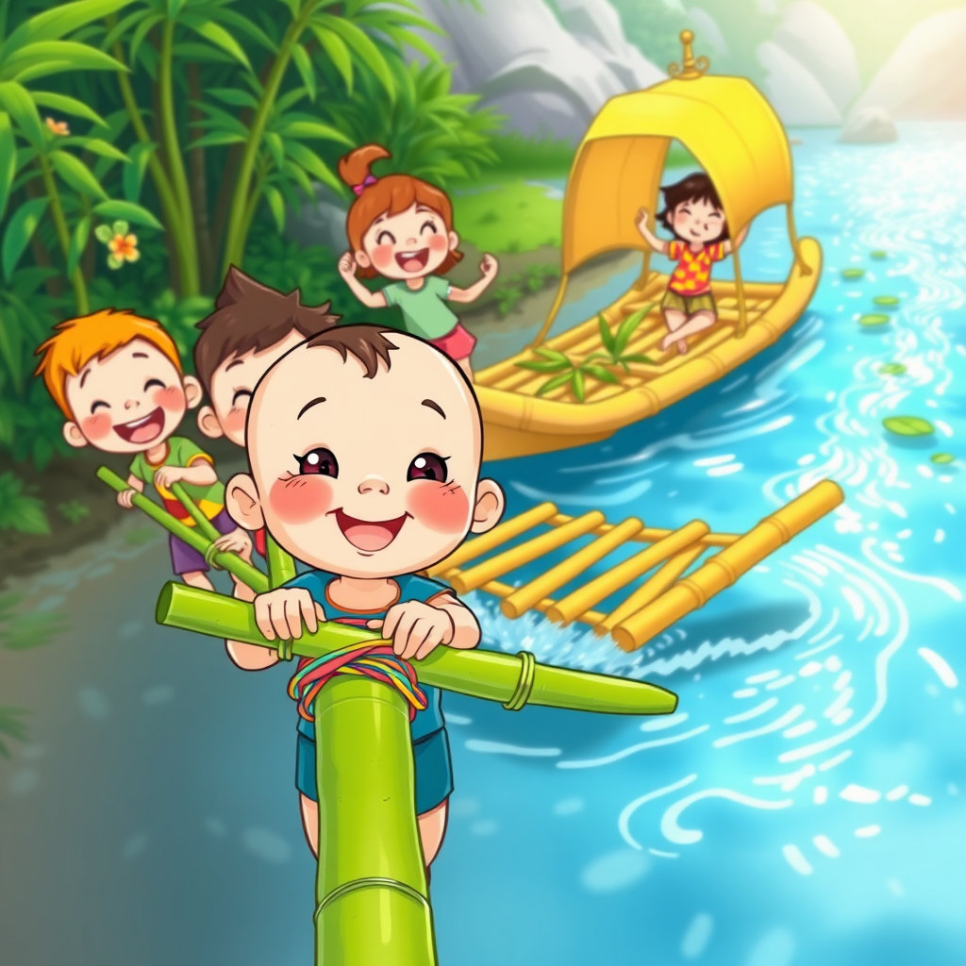 둥글이는 강가로 아이들을 불렀어요. “오늘은 배를 만들 거야!” 대나무를 자르고 묶고, 판자를 올리면서 모두 땀을 뻘뻘 흘렸습니다. 서로 도와주며 완성된 대나무 배는 생각보다 튼튼했어요. 강물 위에 배를 띄우자, 아이들은 환호성을 질렀습니다. 둥글이는 “우리 힘을 모으면 뭐든 할 수 있어!”라고 말했어요. 그날 배는 단순한 놀이도구가 아니라, 우정의 상징이 되었답니다.