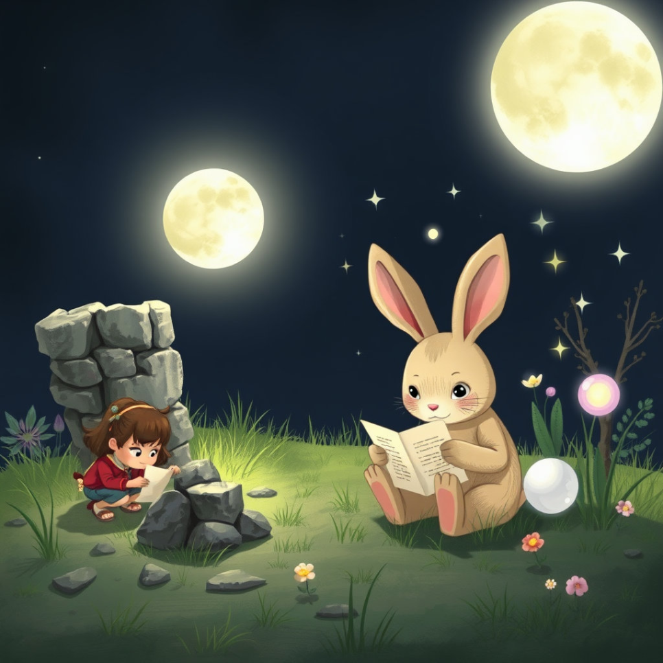 하린이는 마음속에 꼭 하고 싶은 소원을 편지에 써서 돌탑 밑에 묻었다. "달토끼님, 우리 마을에 항상 웃음이 가득하게 해주세요." 편지를 묻고 나니 마음이 한결 가벼워졌다. 그날 밤, 하린이는 꿈속에서 달토끼를 만났다. 토끼는 하린이의 편지를 읽으며 고개를 끄덕였다.